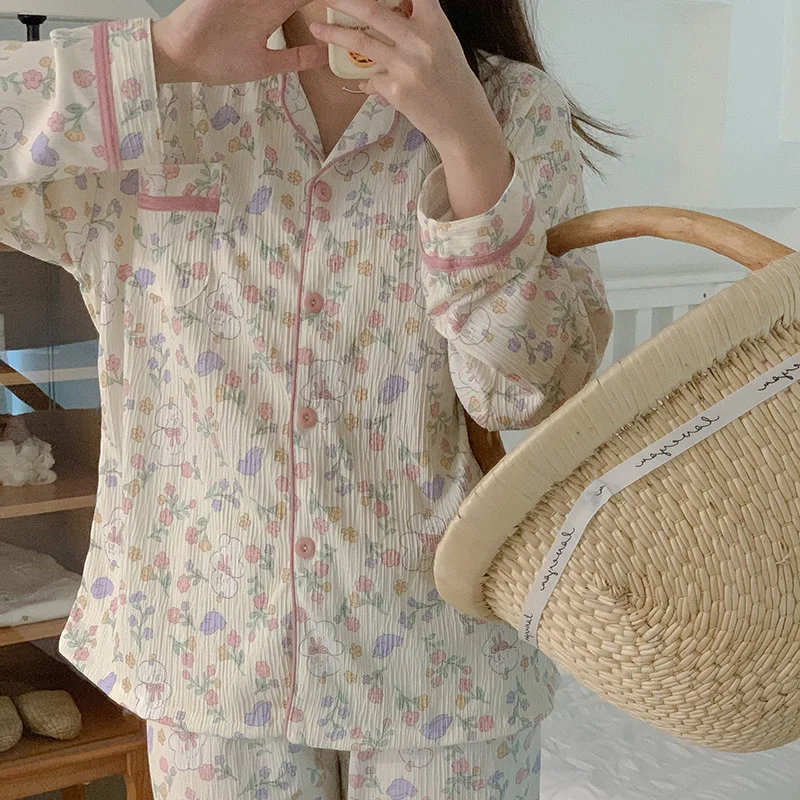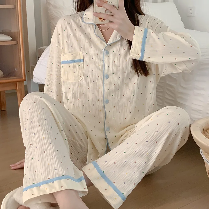 Wholesale Custom Spring Plaid Long-Sleeved Turn-Down Collar Pajama Sleepwear Suit for Women Bubble Cotton Pajama