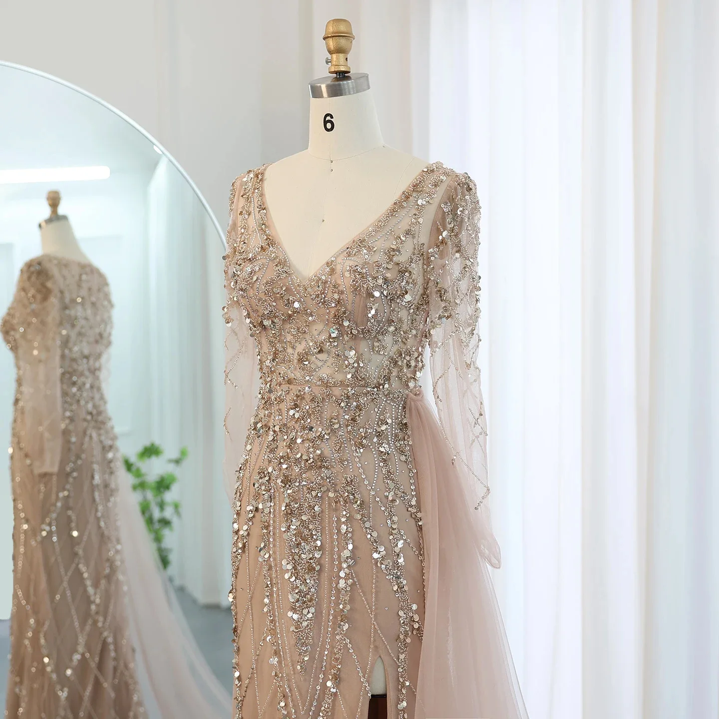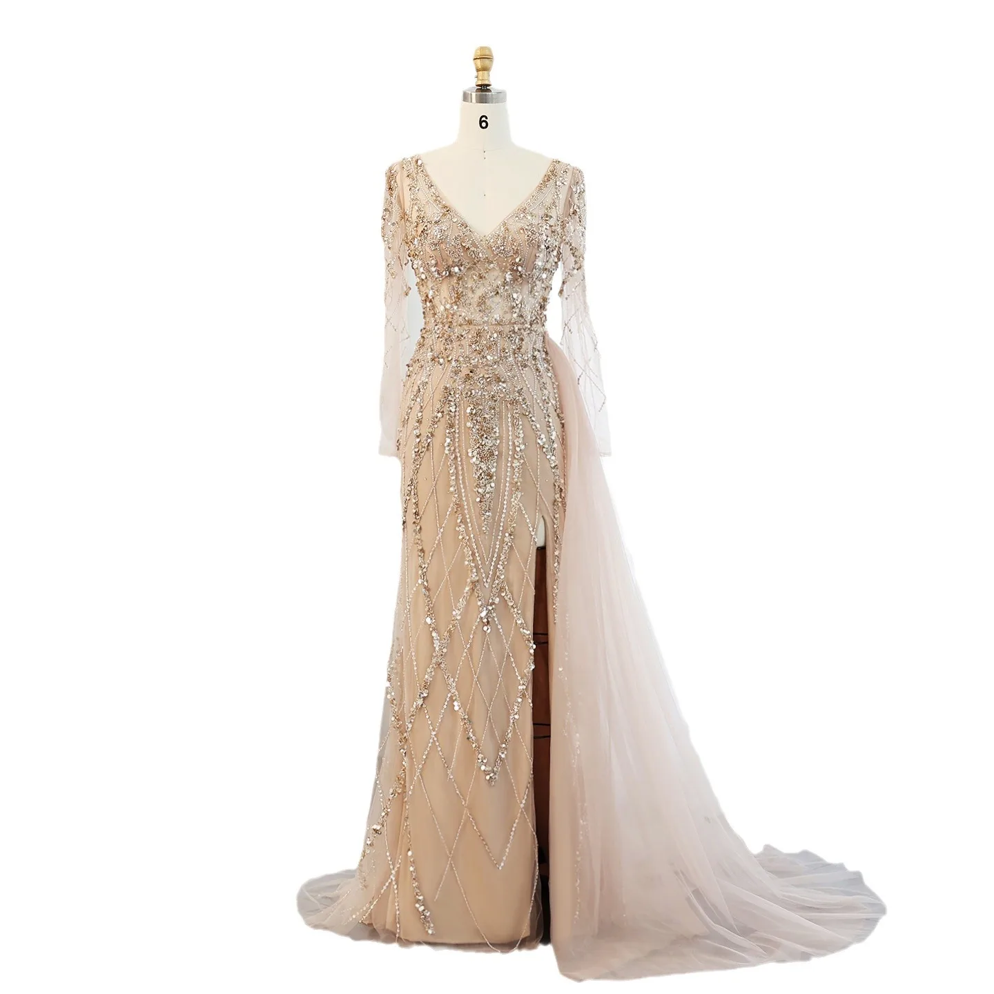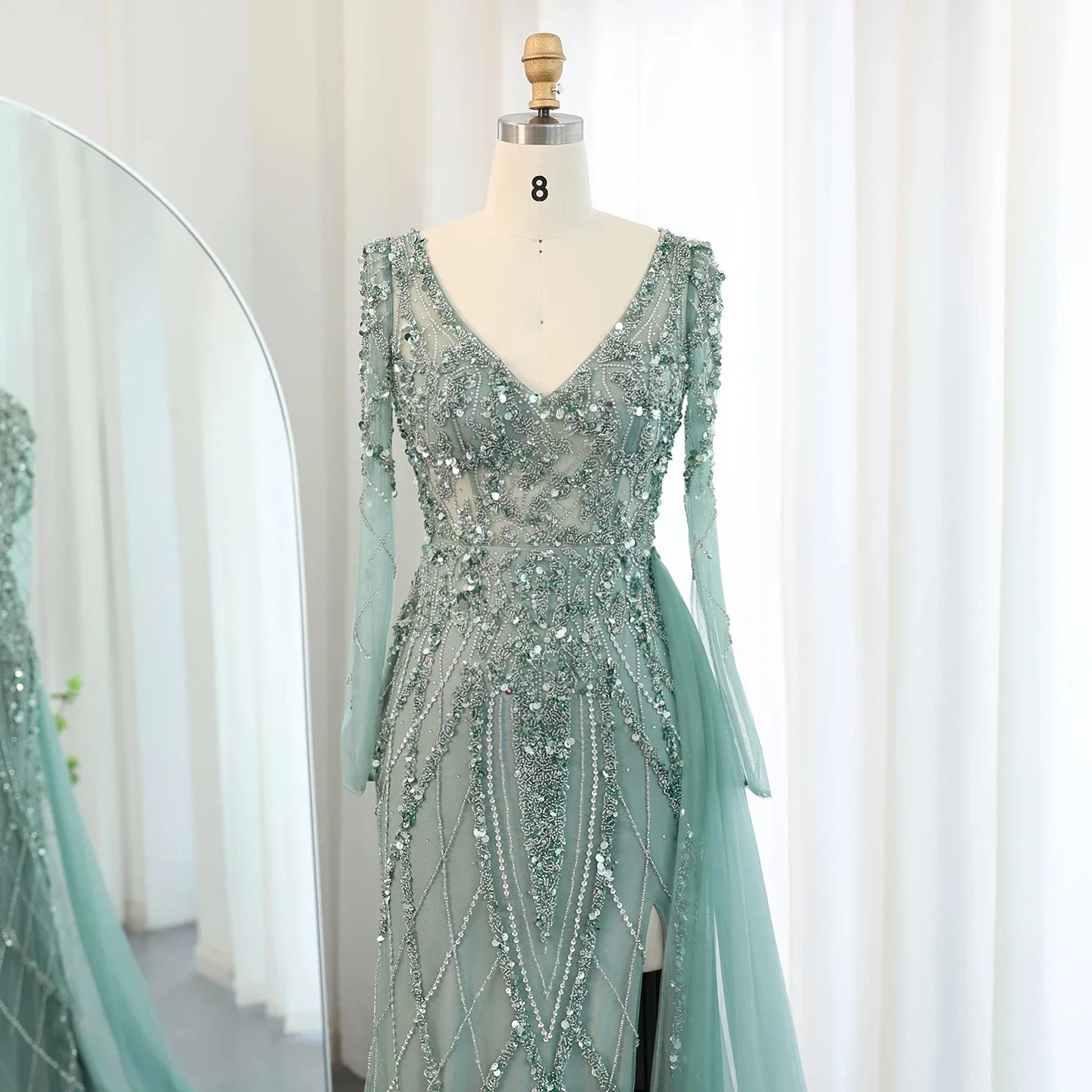 Turquoise Green Mermaid Long Sleeves Evening Dress With Overskirt High Slit Luxury Women Wedding Party Women's Dresses