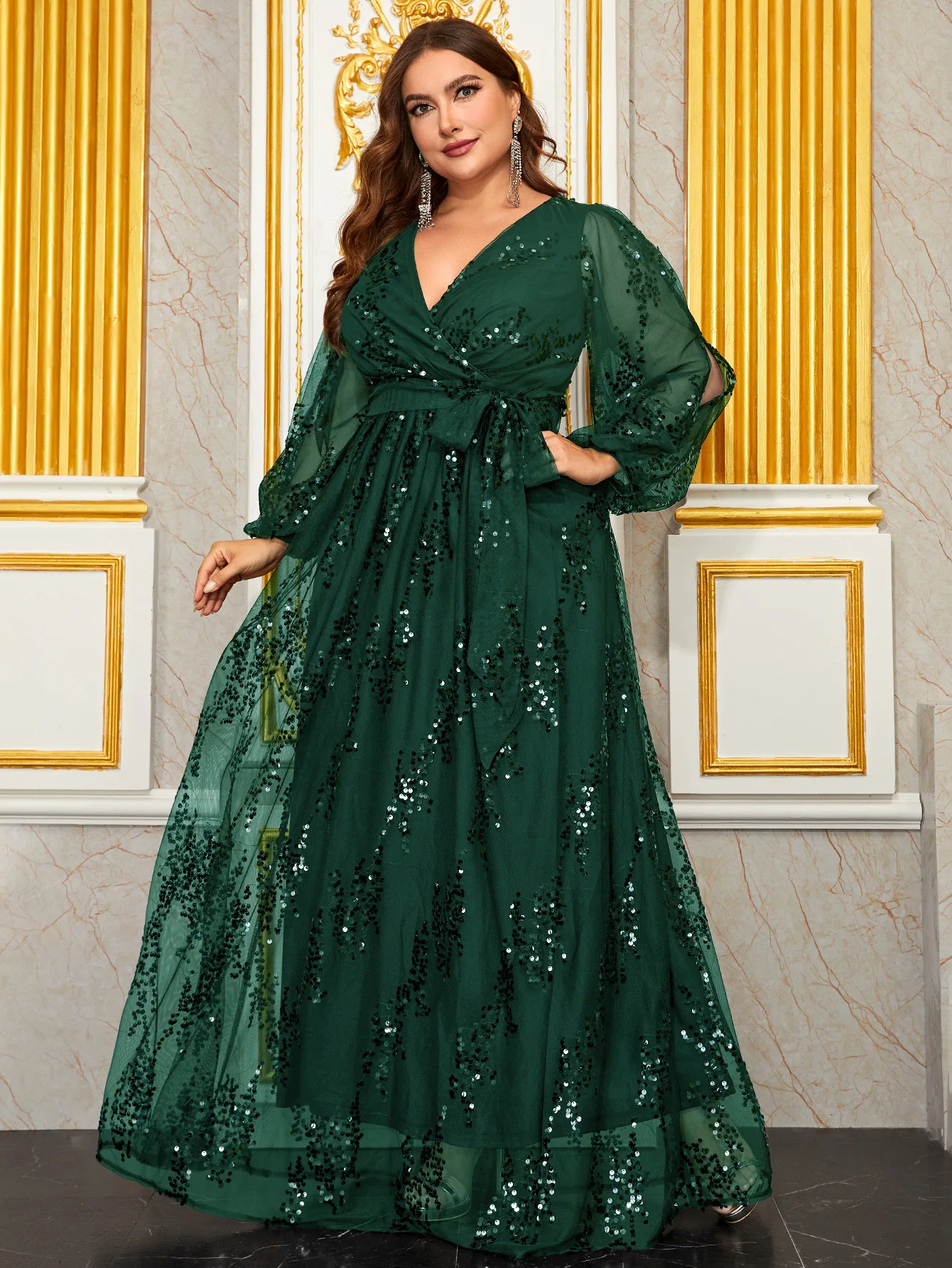 ZYHT 73906 Long Sleeve Deep V Neck High Slit Sexy Elegant Knot Long Floor Length 3D Flower Dark Green Purple Women Evening Dress