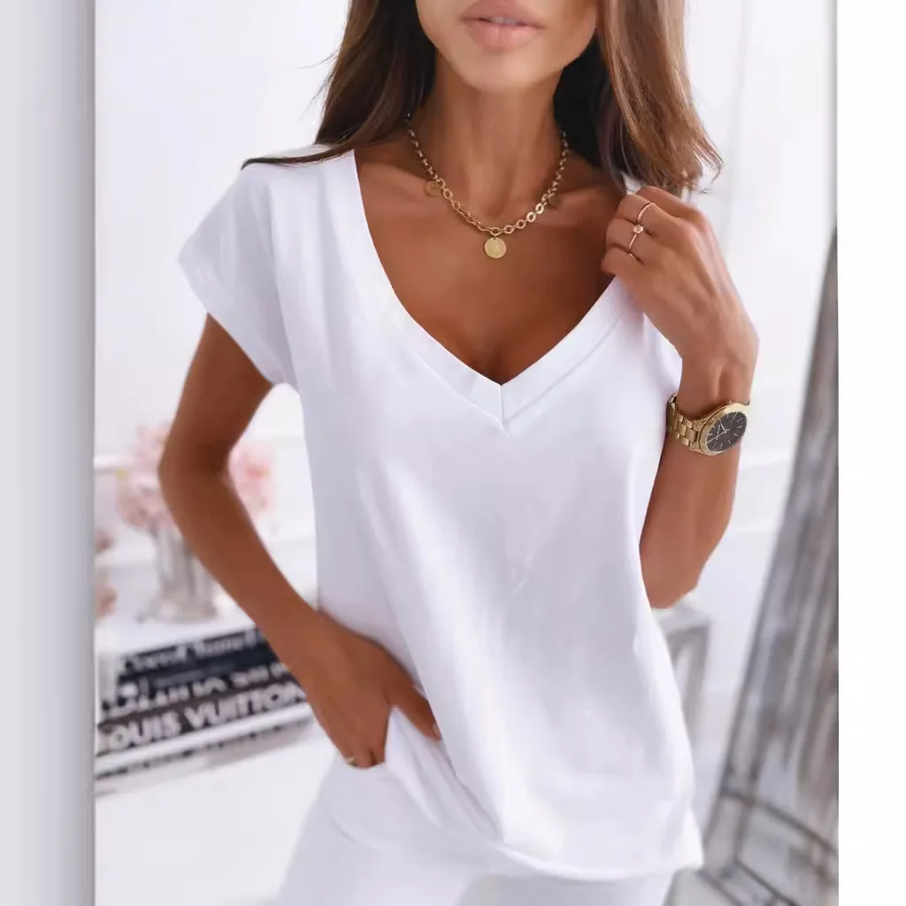 Spring and Summer Solid Color Short-sleeved V-neck Simple T-shirt Tops for Women