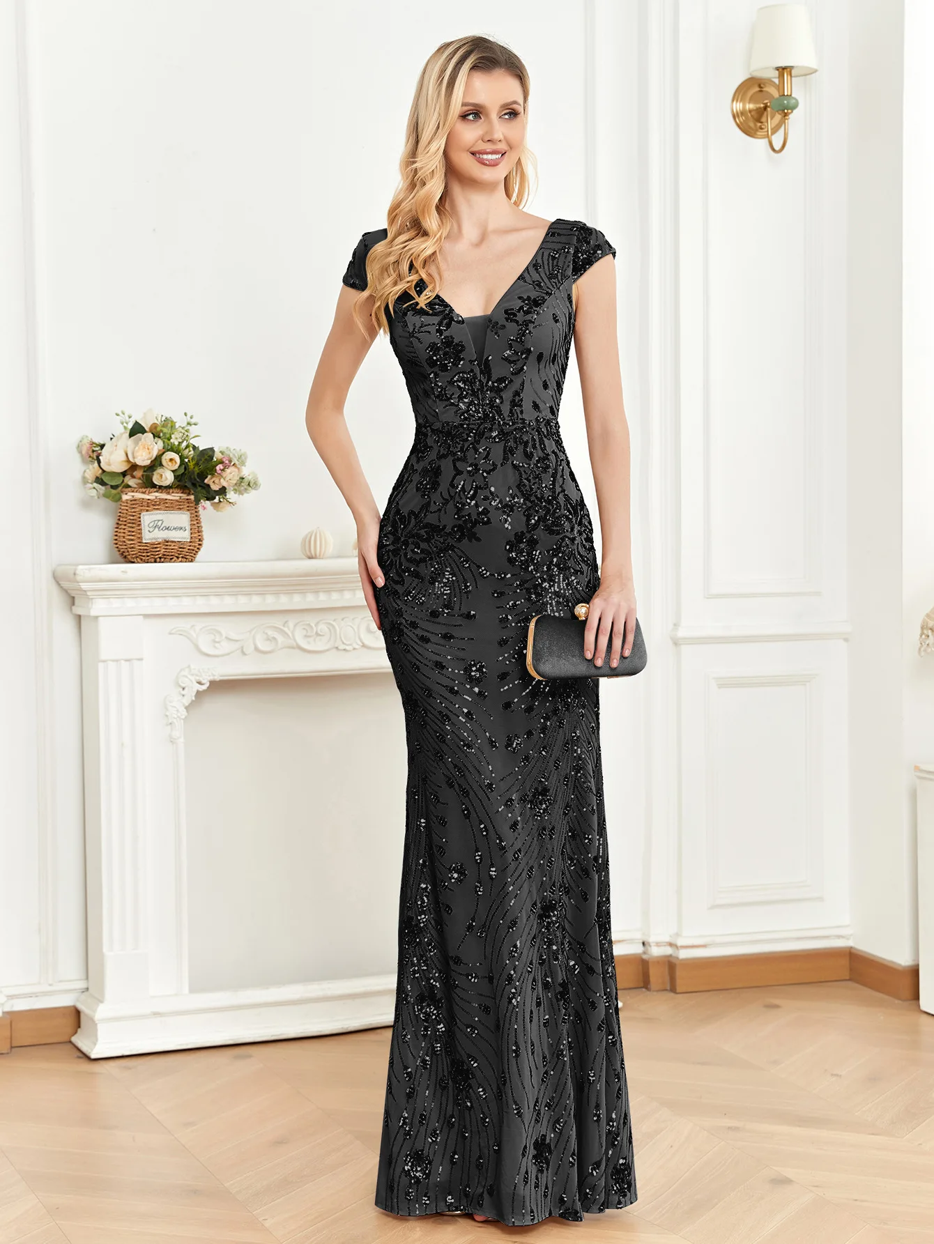 Fashion Women's Evening Dress Sequined Elegant Slim Fishtail Party Dress Champagne Short Sleeve Sexy V-neck Banquet Dress