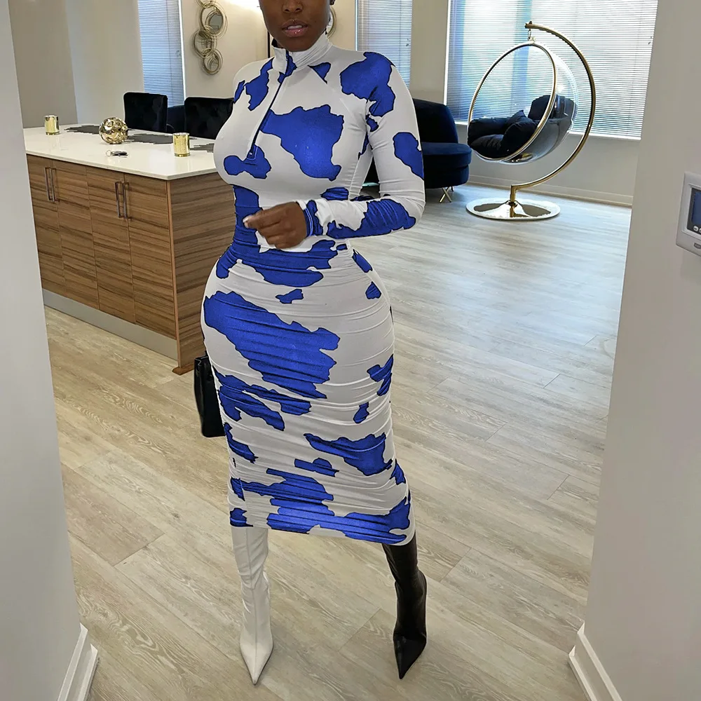 ZYHT 73963 Matte Satin Printed Geometric Pattern Maxi Women Asymmetric One Shoulder Ruched Hem Women Dress