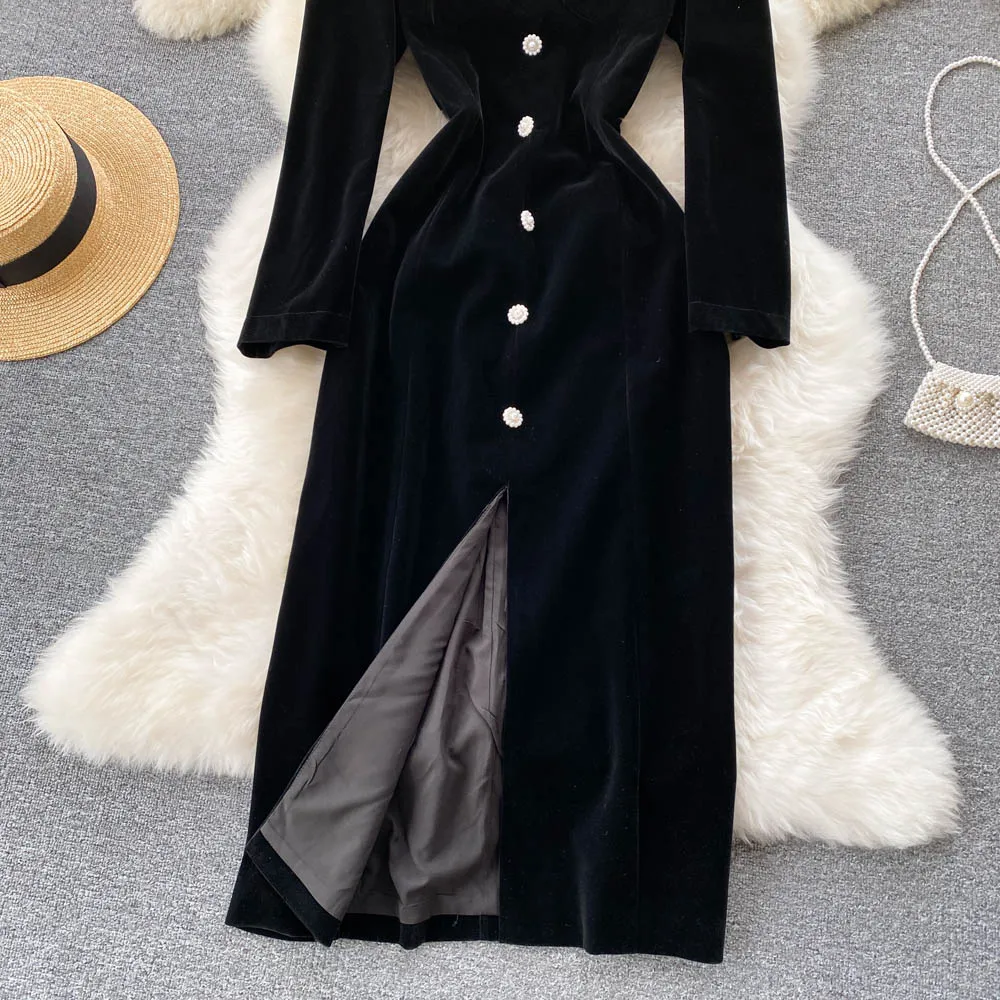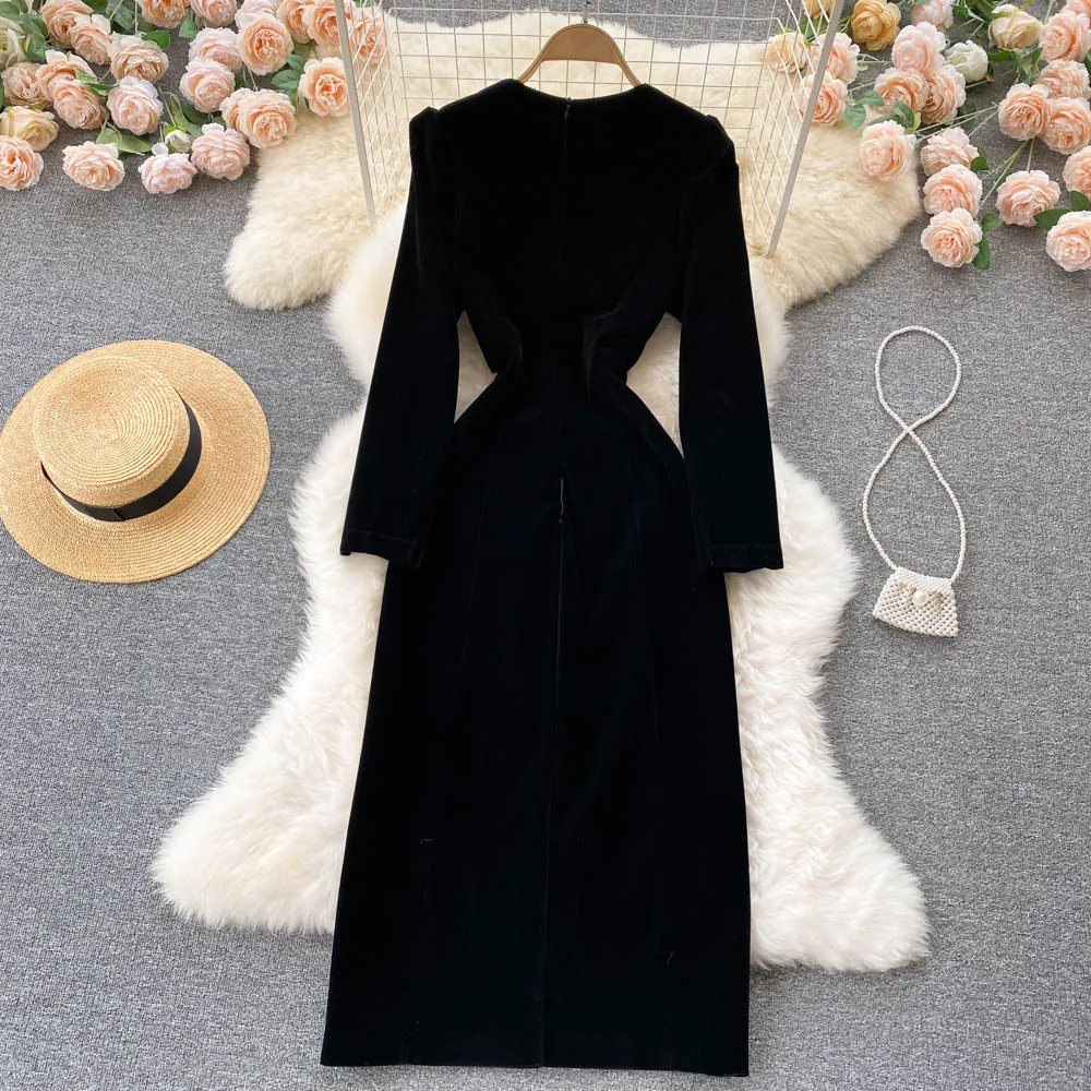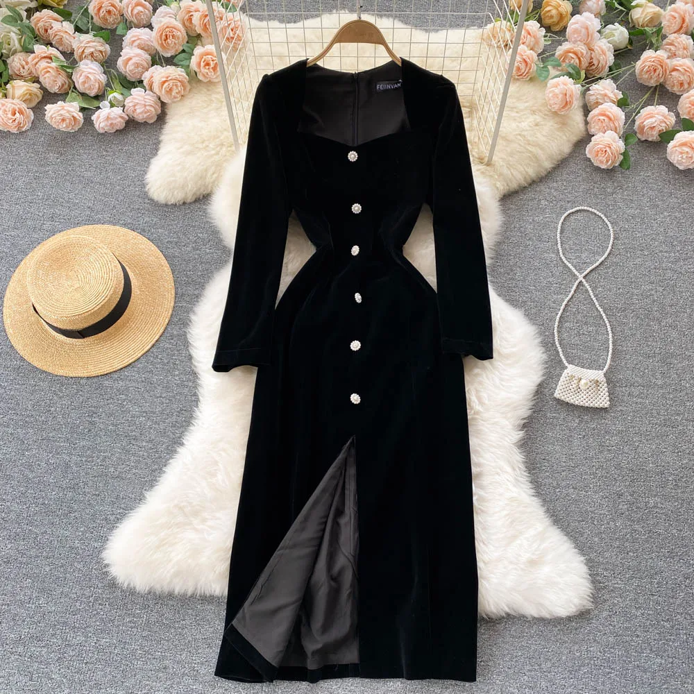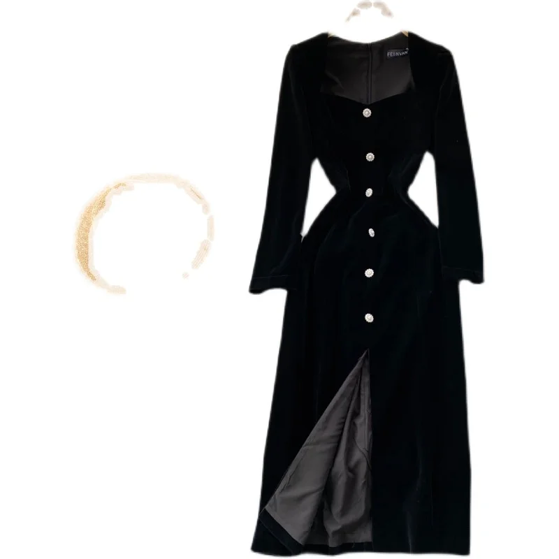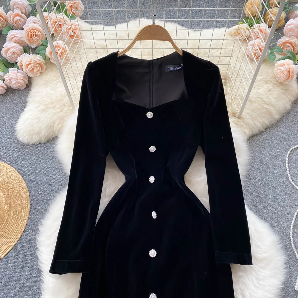 Autumn Square Collar Velvet Casual Dress Women High Waist Midi A-Line Dress Ladies Elegant Dresses Clothes Women Wholesale