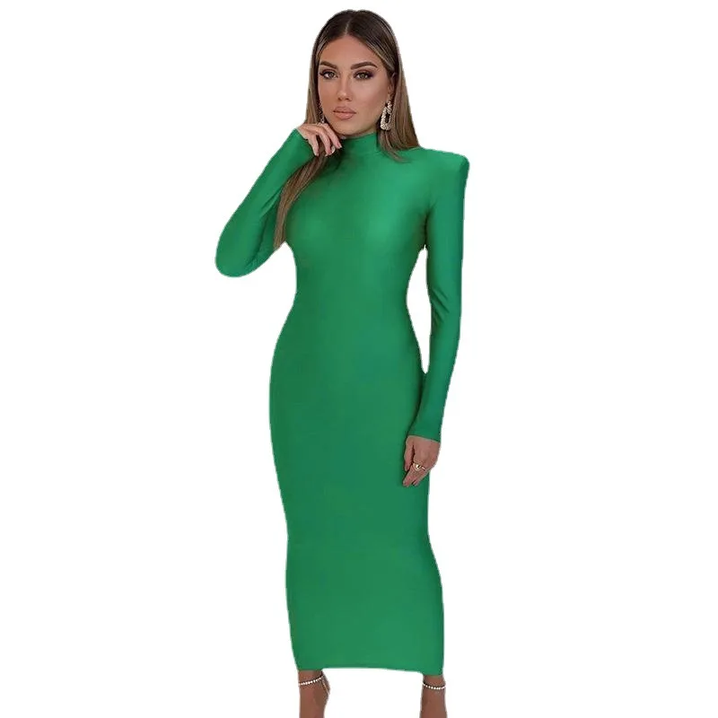European and American Style Women's Semi-high Collar Slim Long-sleeved Dress High Waist Slim One-step Long Skirt
