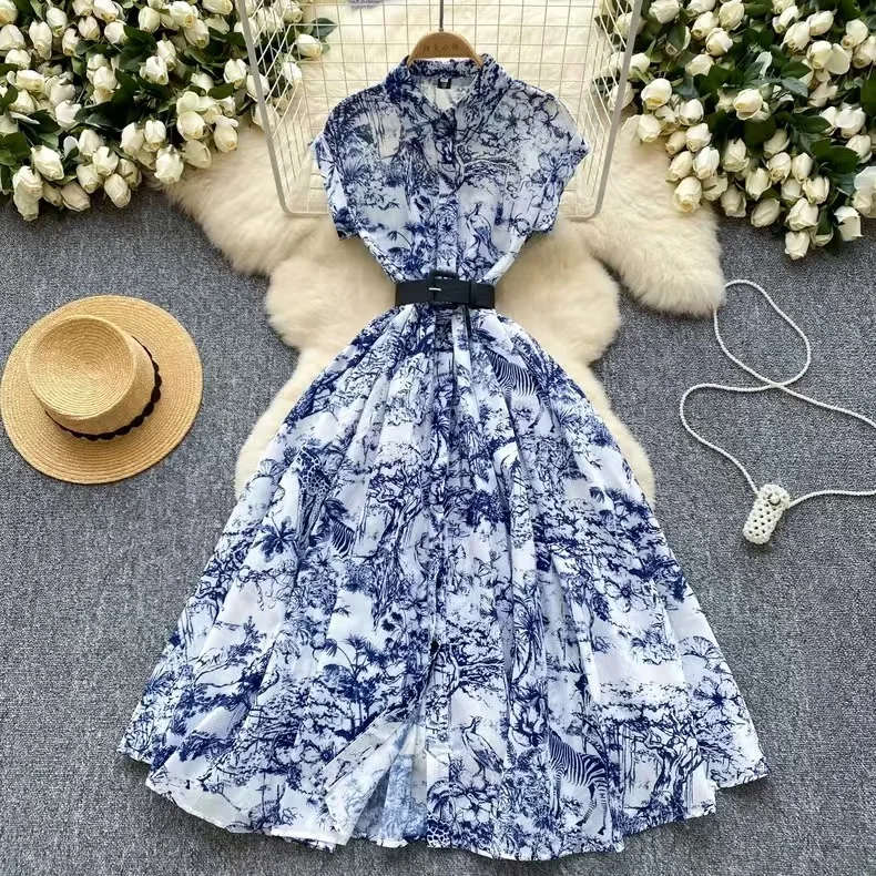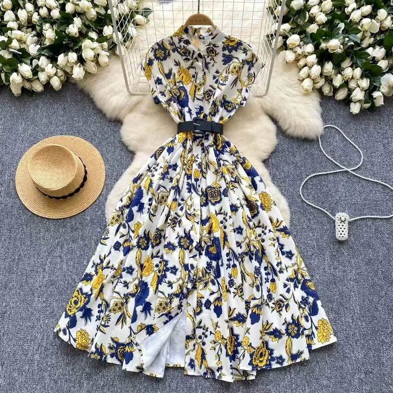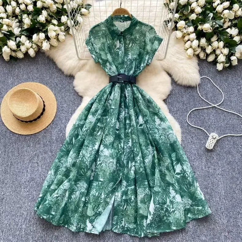 French Vintage Print Dress Women Fashion Elegant Lapel Waist Short Sleeve Shirt Casual Dress