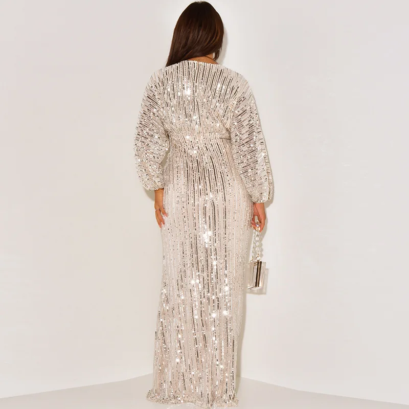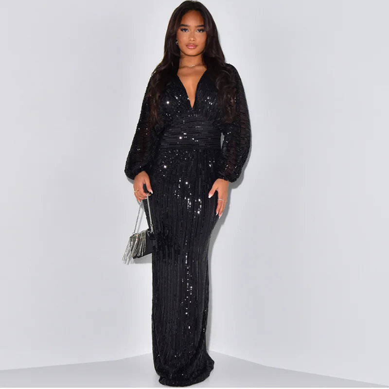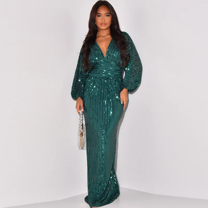 Latest Luxury Mermaid Design Elegant V-Neck Slim Sequin Maxi Dress for Women Vintage Style Party Dresses Lace Belt Club 2 Pieces