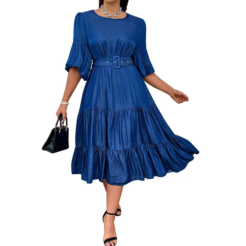 High-Quality Jeans Dresses Women Casual Puff Sleeve O-neck Ruched Denim Dresses for Women Ladies With Belt