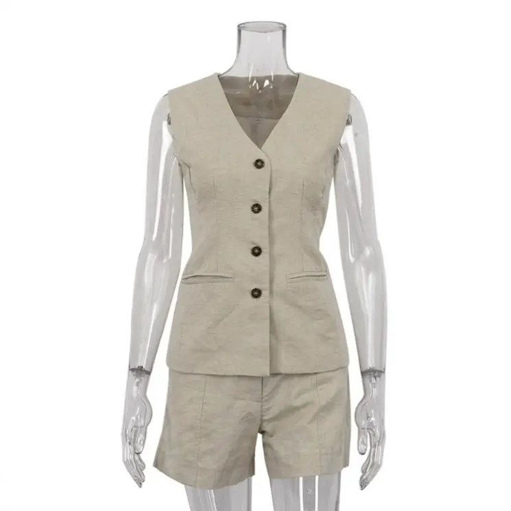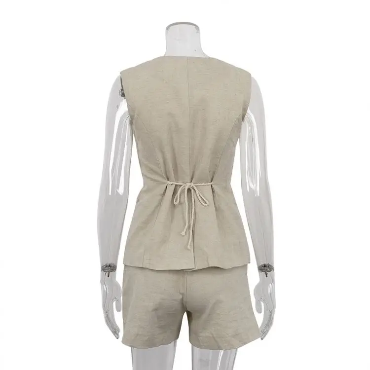 Women's Linen Cotton Two-Piece Set Sleeveless Vest Waistcoat Suit Shorts Casual Style Dropshipping Summer Loose Trade Clothing