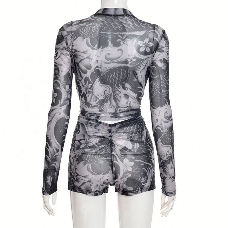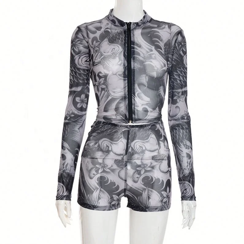 Dropshipping 2026 Popular Fall New Design Mesh Printed Tracksuit Two Piece Women's Shorts Set