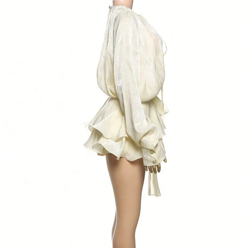 ZYHT 82053 Apricot Lace Top with Tiered Ruffled Sleeves V-Neck & Gold Buttons Blouse Wanita Elegan Women Blouse