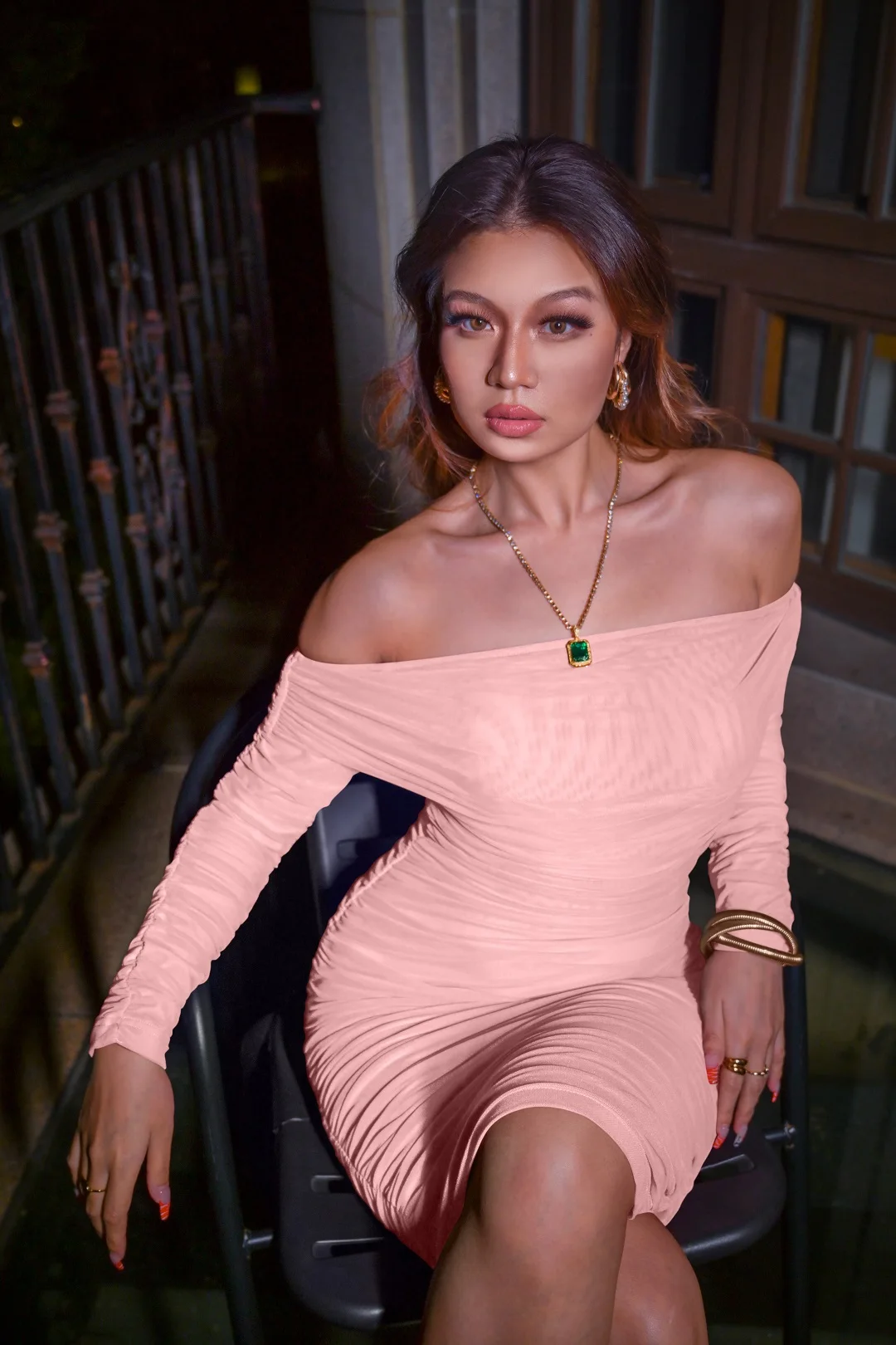 ZYHT 73905 Dusty Rose Off-The-Shoulder Long Sleeve Stretch Jersey Dress Ruched Bodice Floor Length Fish Tail Maxi Dress