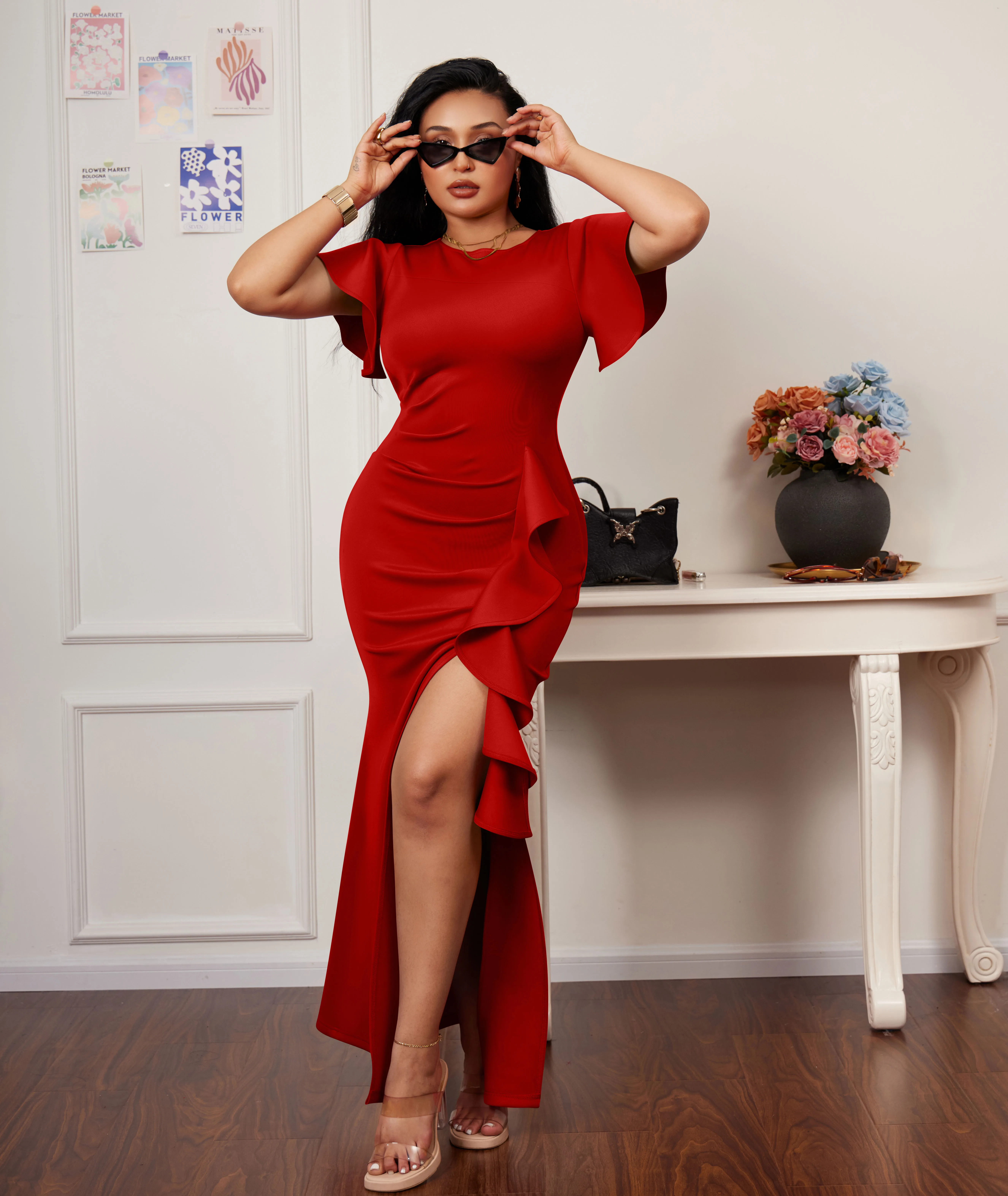 New Arrive High Waist Lotus Leaf Sleeves High Split Ladies Party Evening Dress