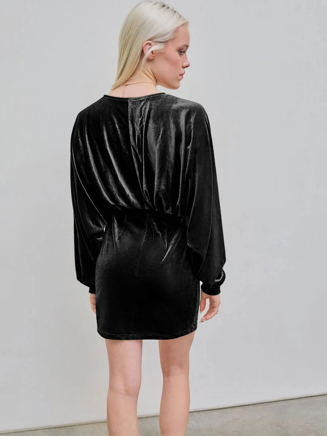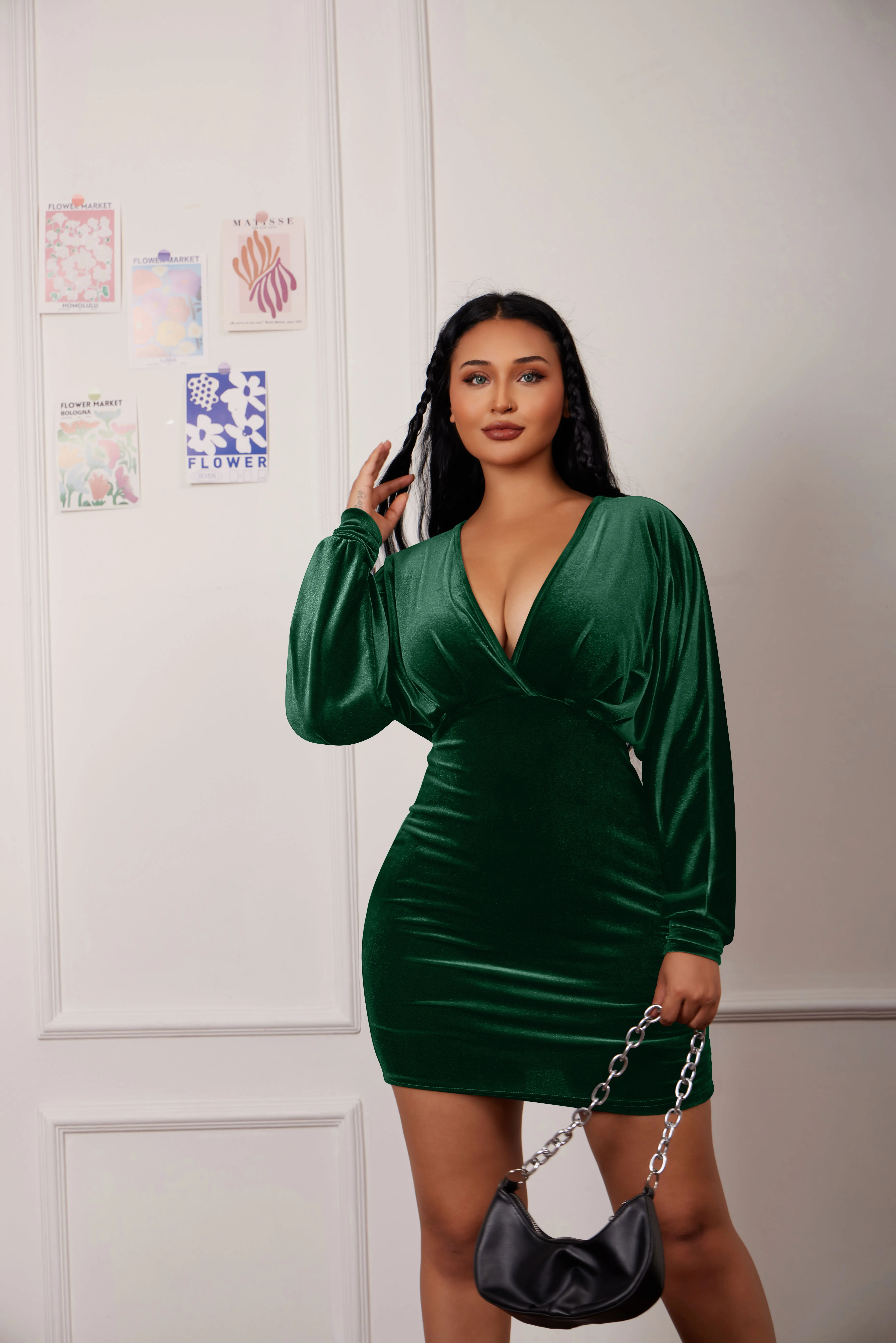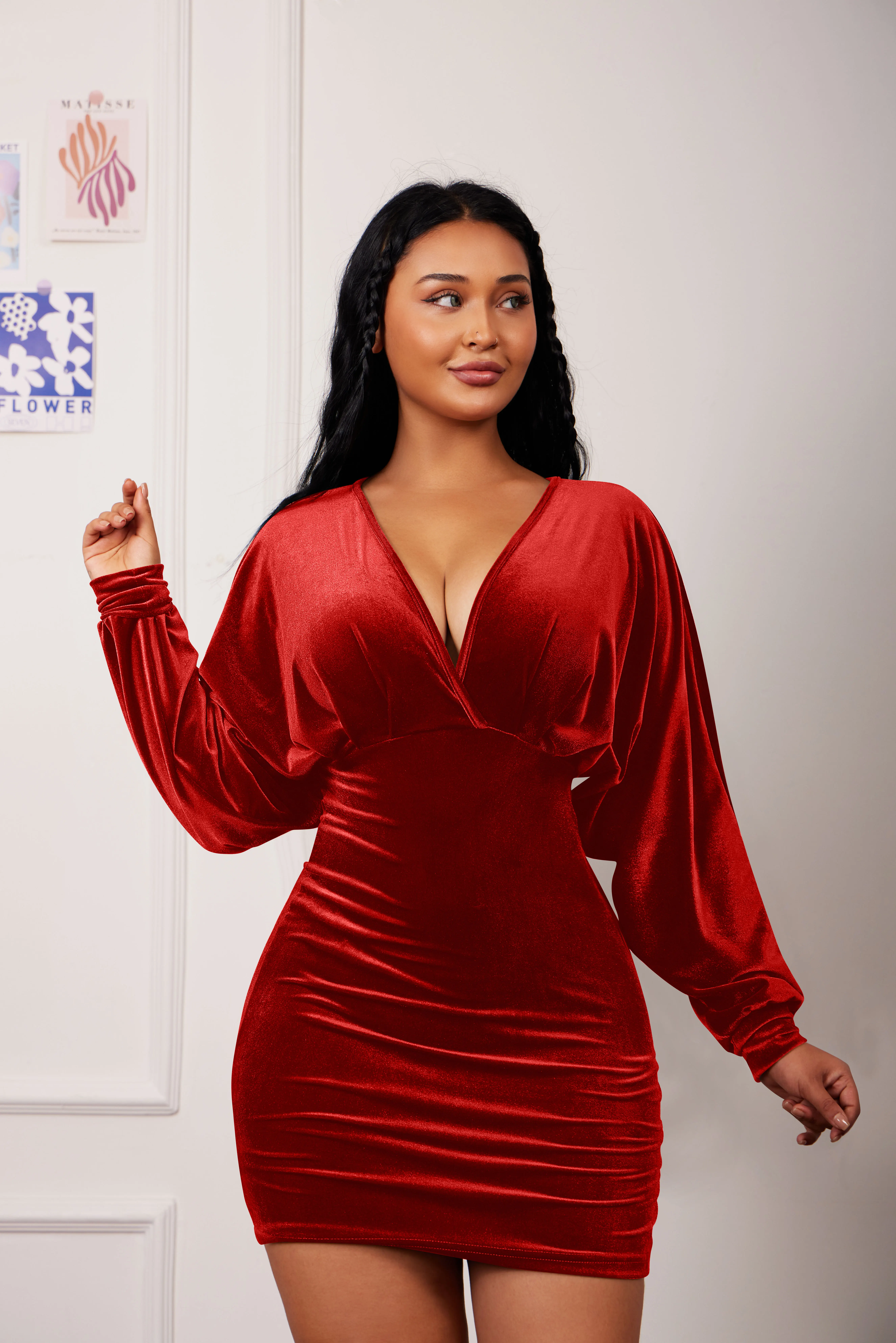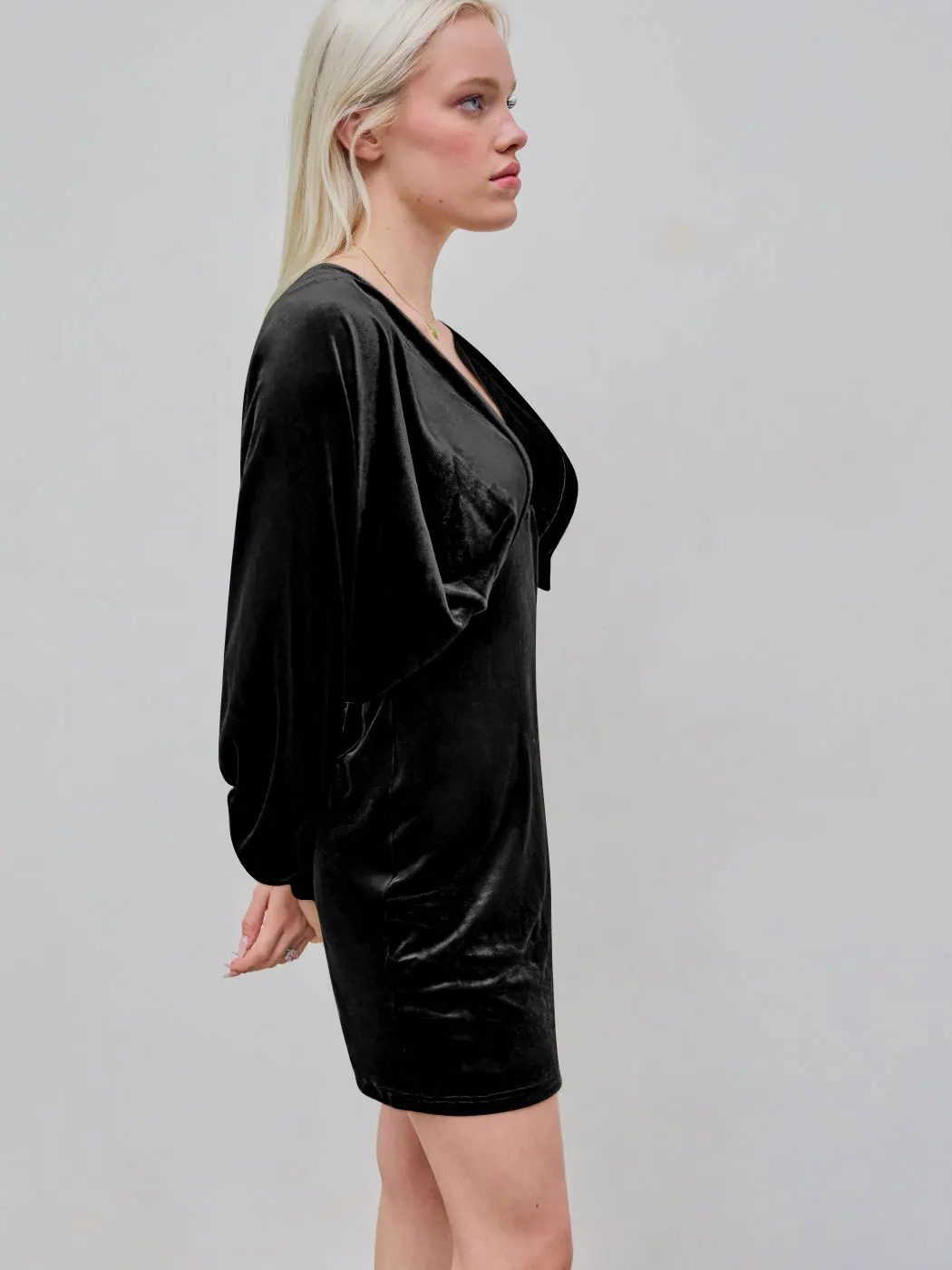 New Women's Elegant Deep V Neck Long Sleeve Batwing Bodycon Velvet Mini Party Club Dress