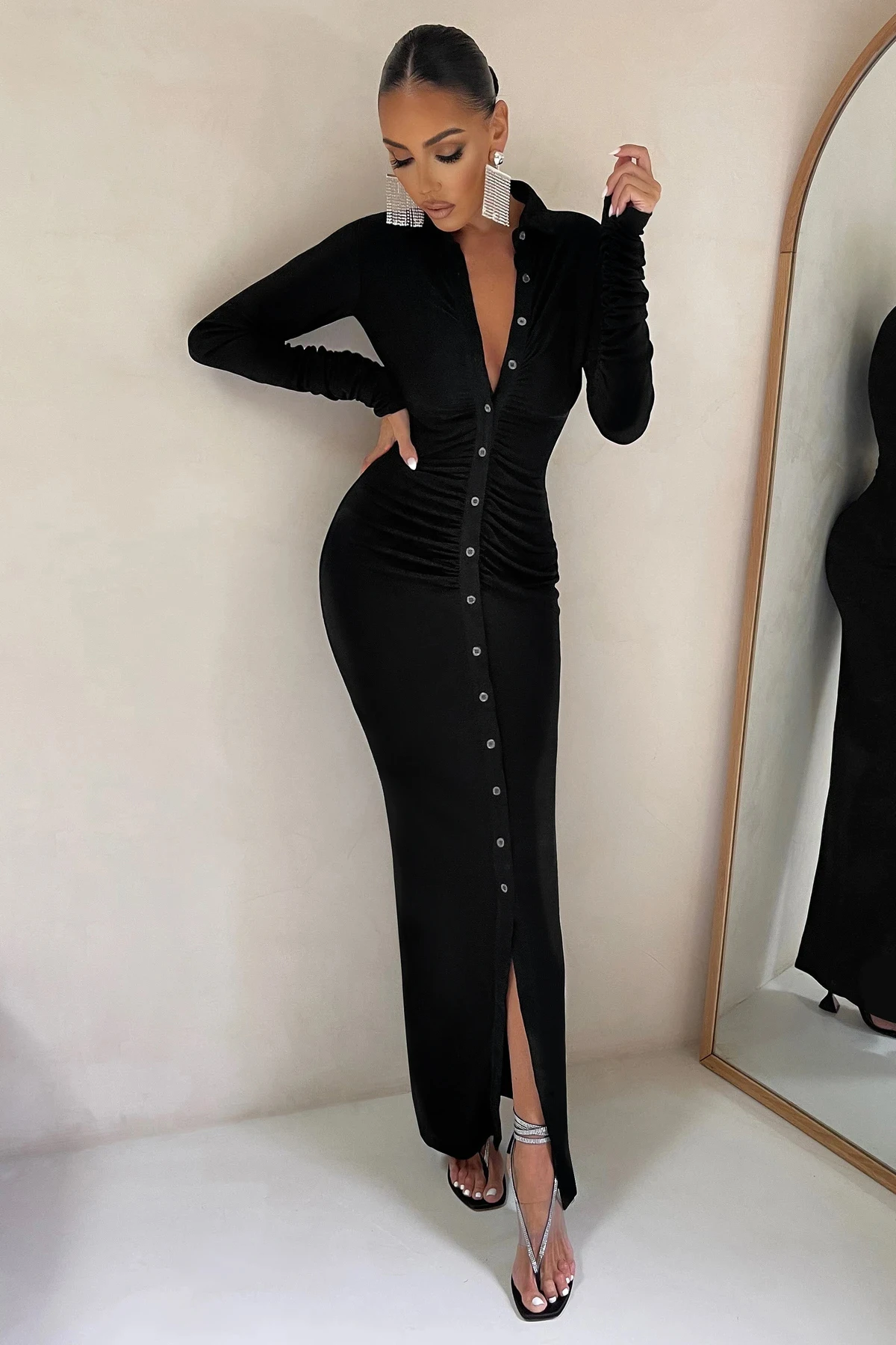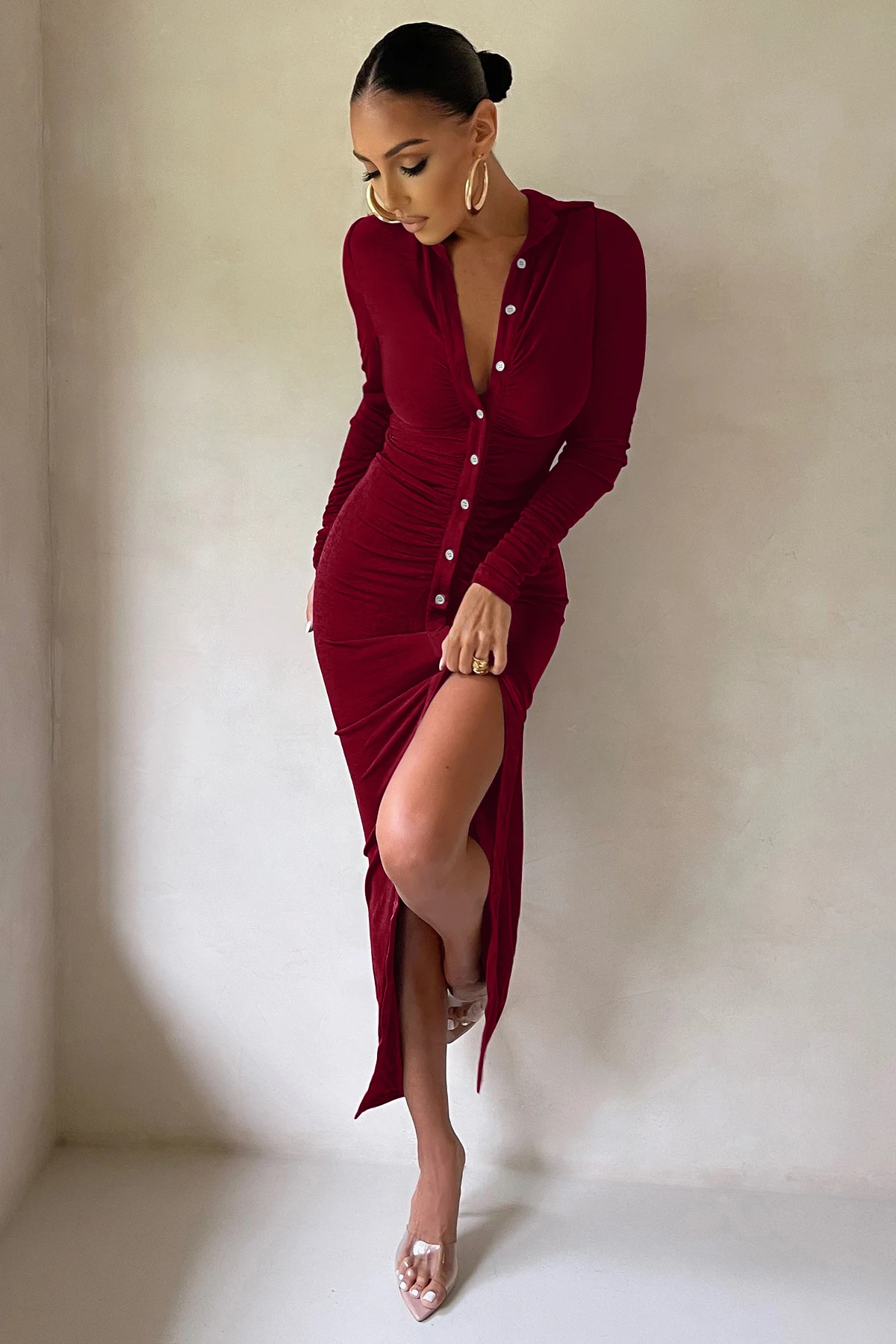 High Quality Dresses Long Sleeve v Neck Ruched Turndown Neck Slit Dinner Dresses Women Elegant With Button