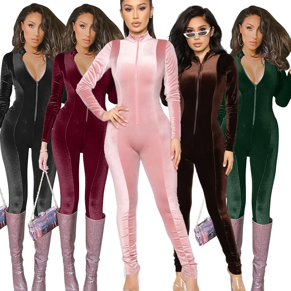 Custom logo Jumpsuit Ladies Velvet Long Sleeve Zip up Solid Sexy Romper Women Jumpsuit