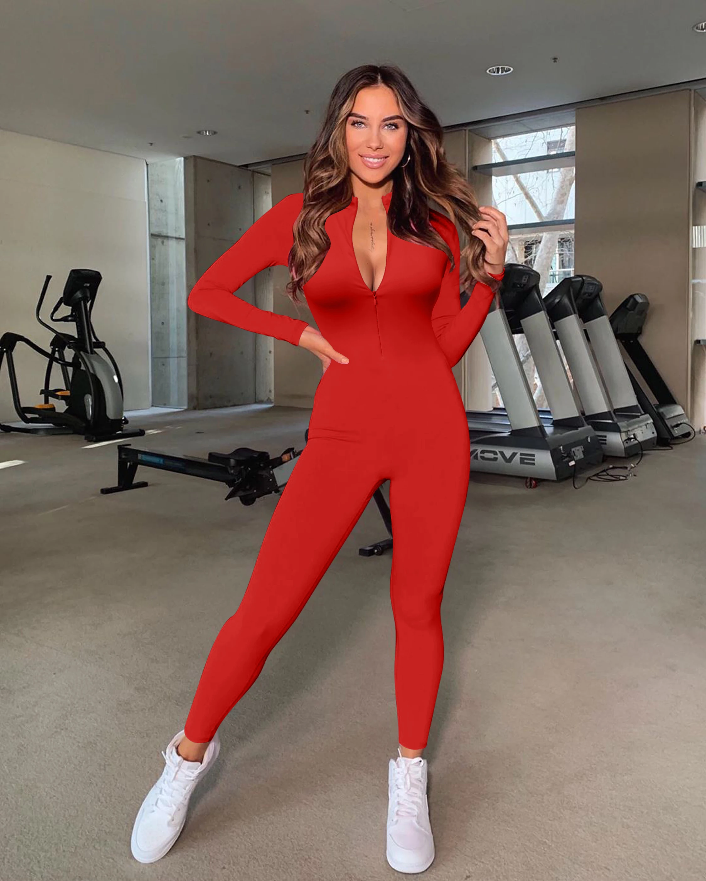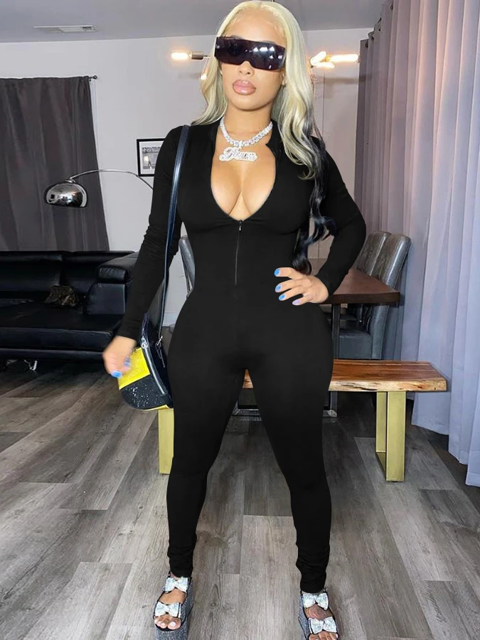 Custom logo Women Long Sleeve Jumpsuit One Piece Solid Zipper Bodycon Skinny Women's Jogging Jumpsuit
