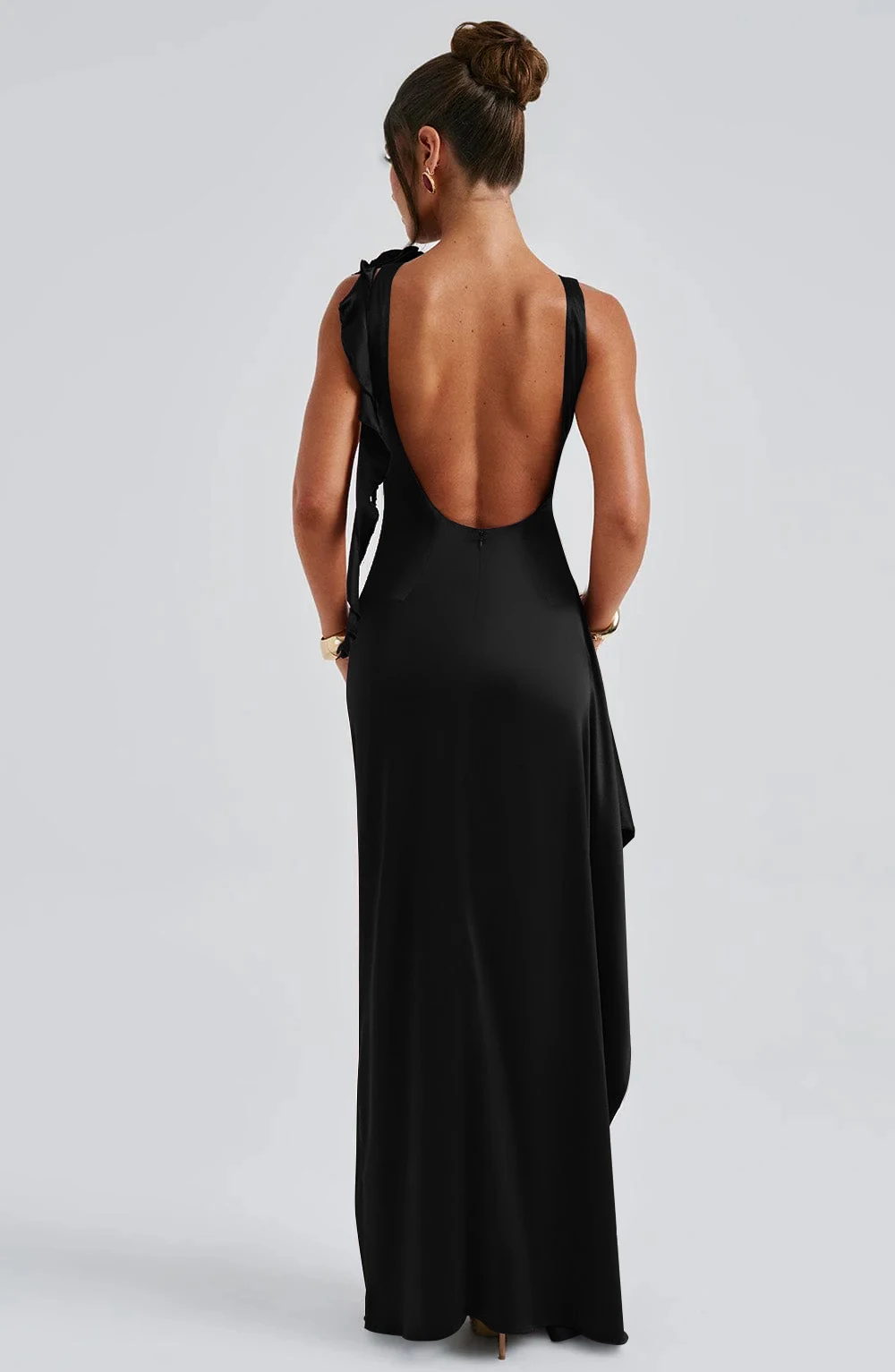 New Sleeveless High Waisted Pleated Design Elegant Backless Shoulder Flower Evening Dress