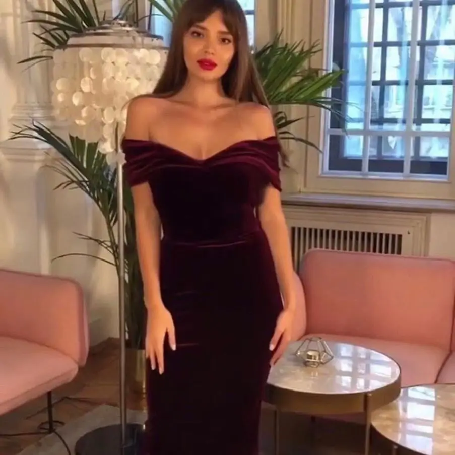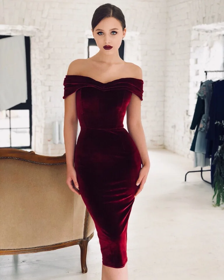 New Arrival Sexy Elegant One Word Collar Strapless Bodycon Midi Ruched Velvet Ladies Wear Dress