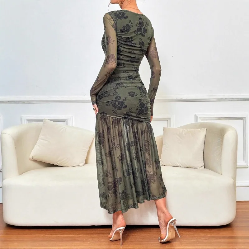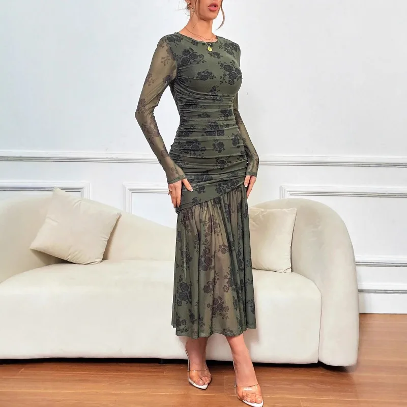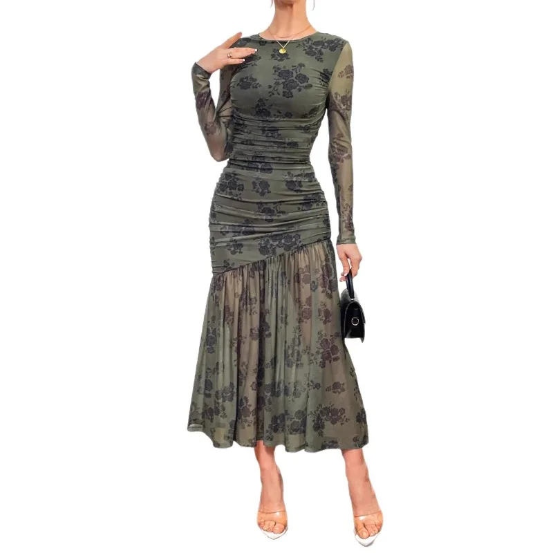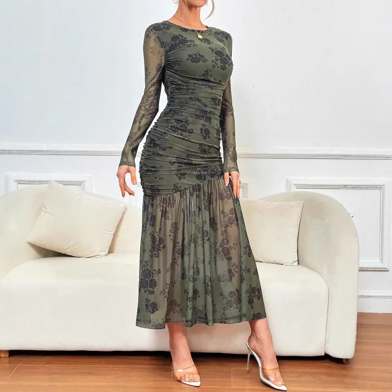 Floral Print Mesh Dress Long Sleeved Pleated Women Long Dress Wholesale