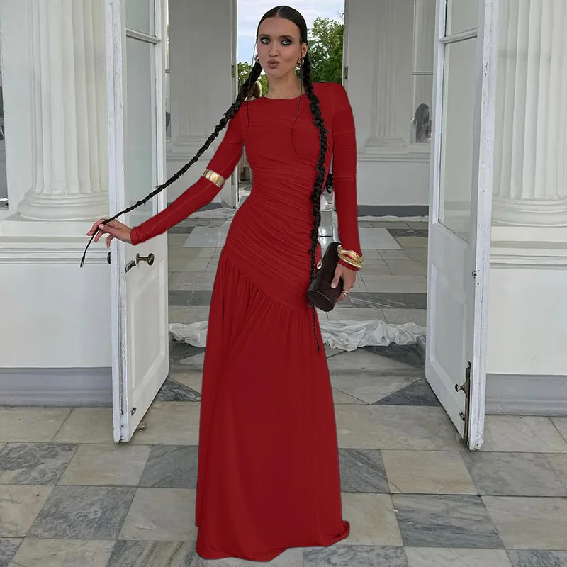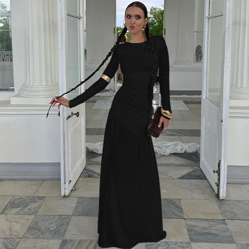 ZYHT 73849 European Wholesale Fashion Casual One Shoulder Ruched Maxi Dress Side Slit Pleated Long Sleeve Dresses for Women