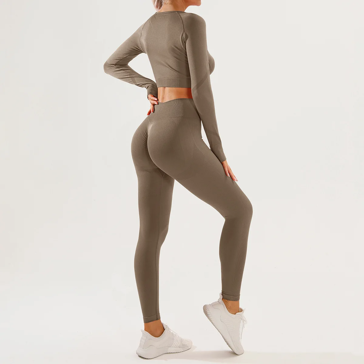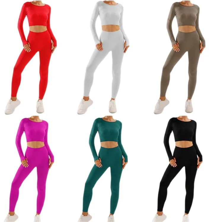 Seamless Yoga Suit Women's Long Sleeved Long Pants Thumbholes Crop Top Two-piece Set Slim Fit Fitness Pants Set