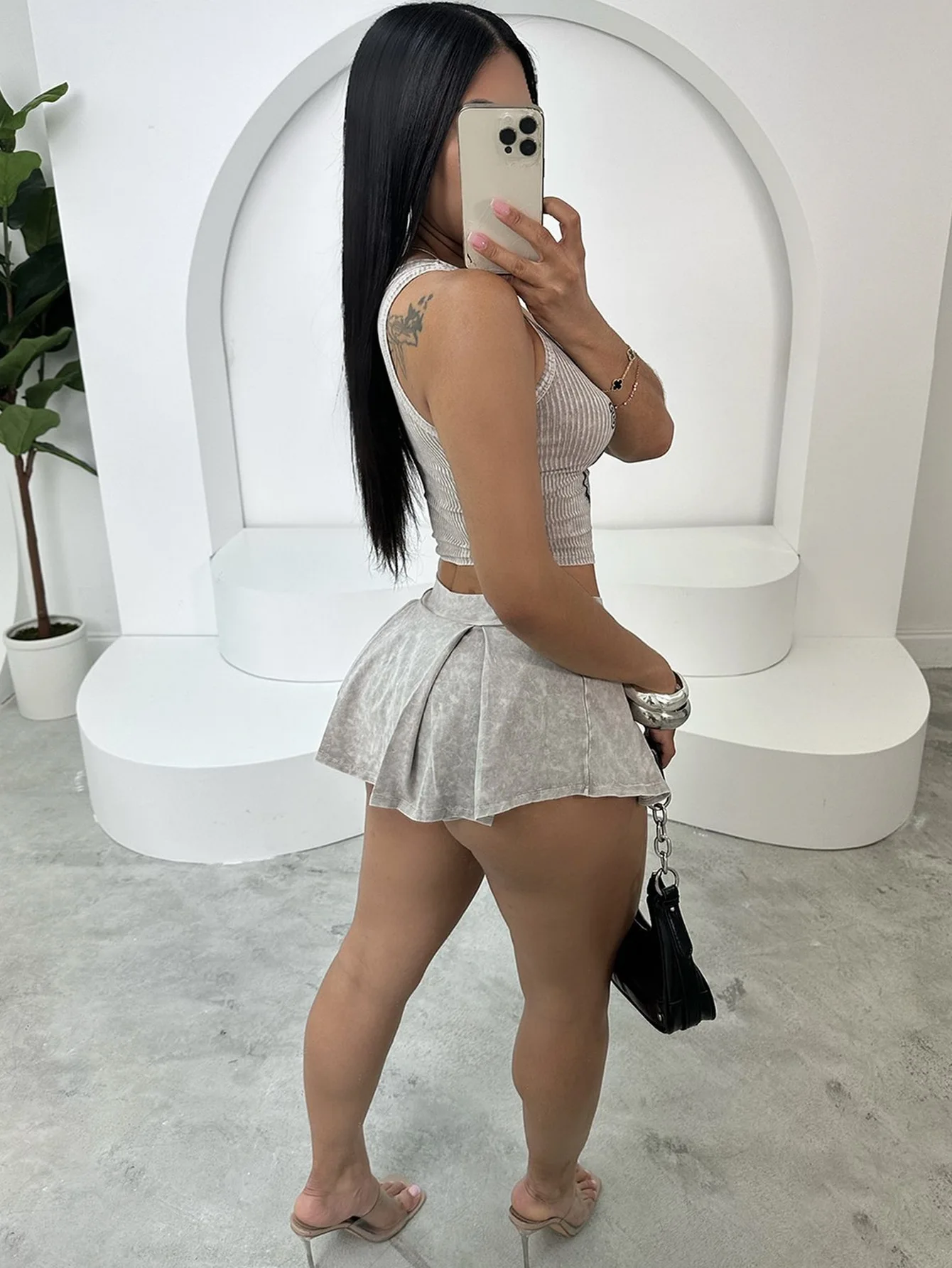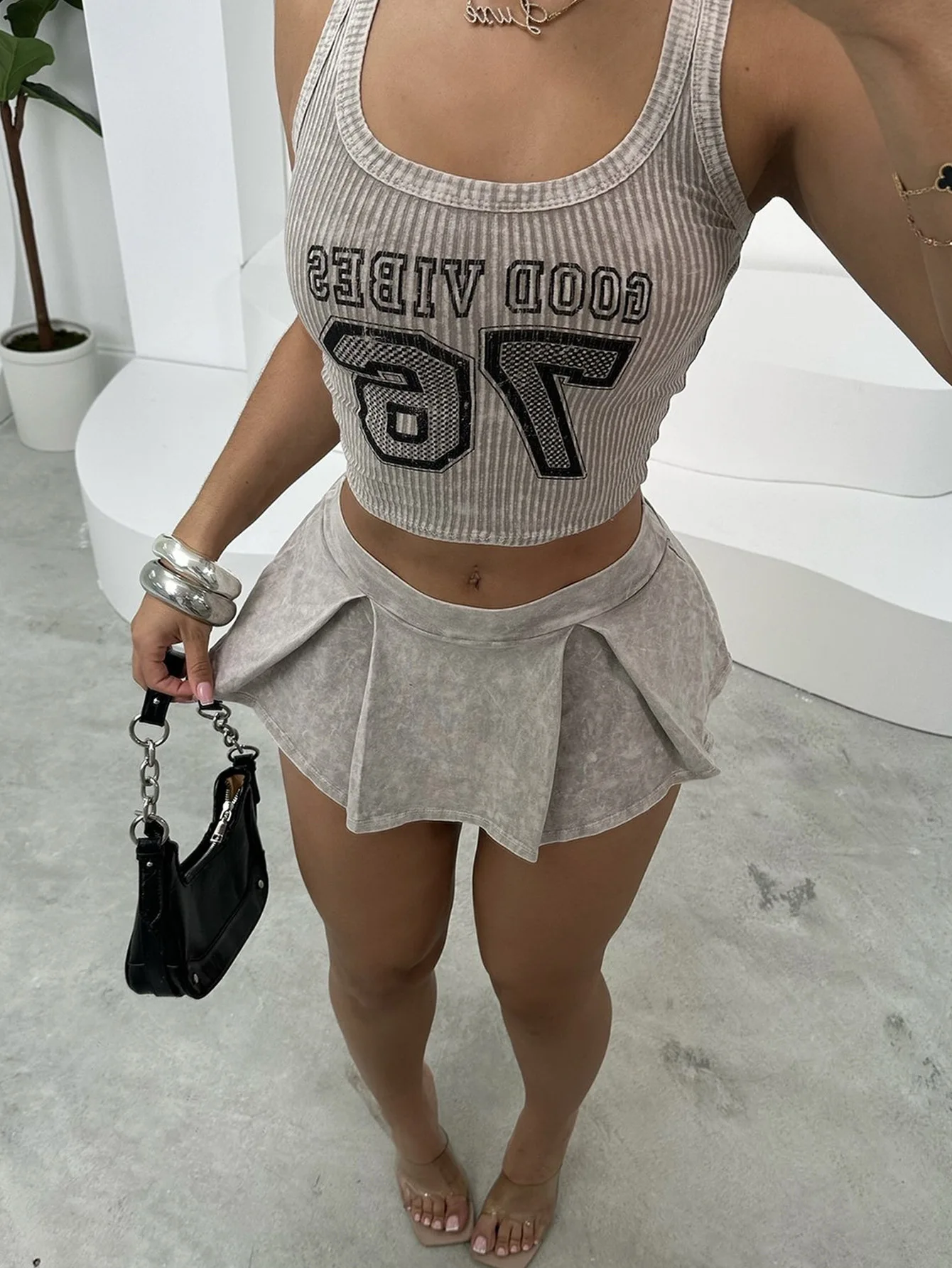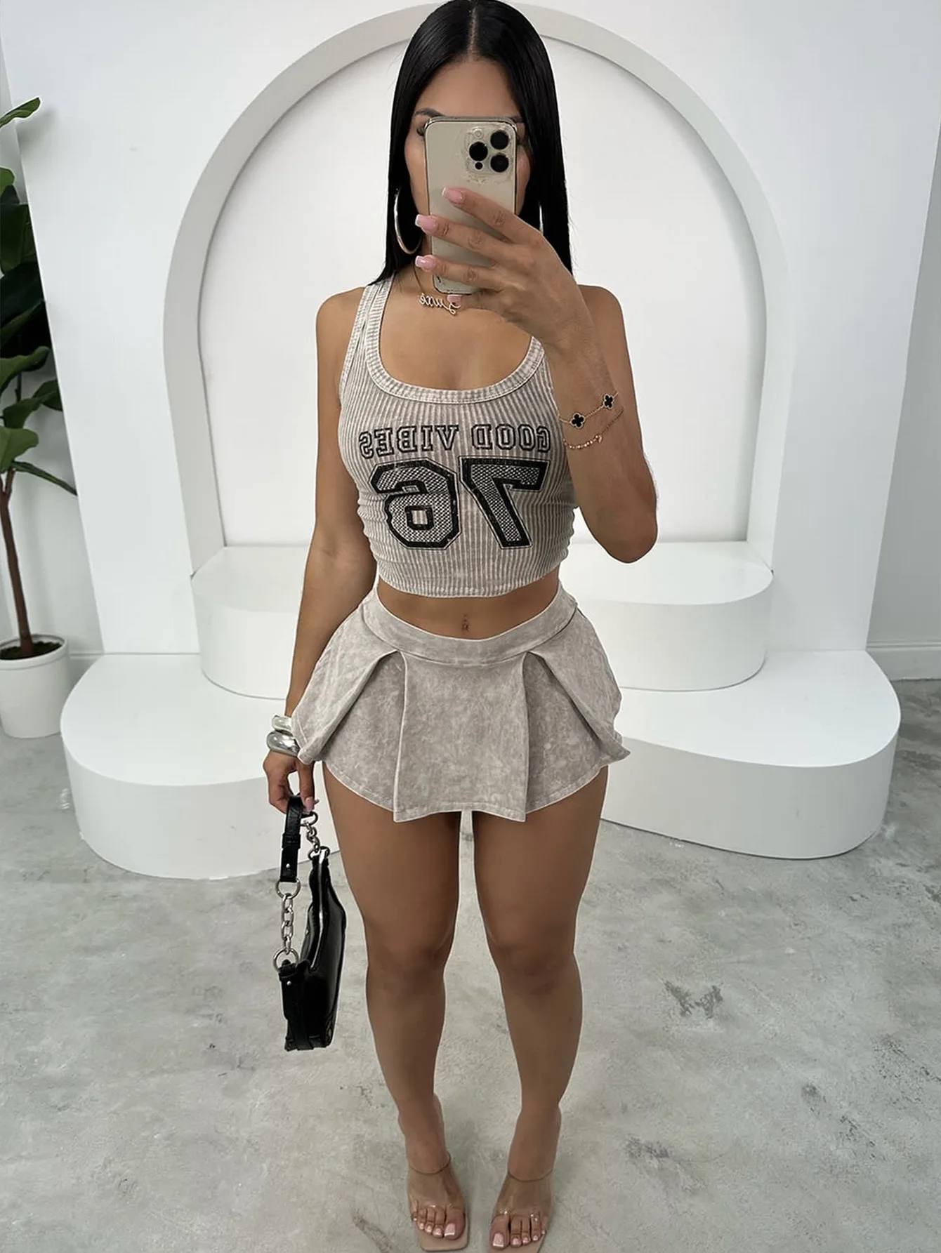 Summer Short Vest Top Pleated Skirt Suit Casual Pit Tight Hot Girl Design Skinny Plain Dyed Two Pieces Set