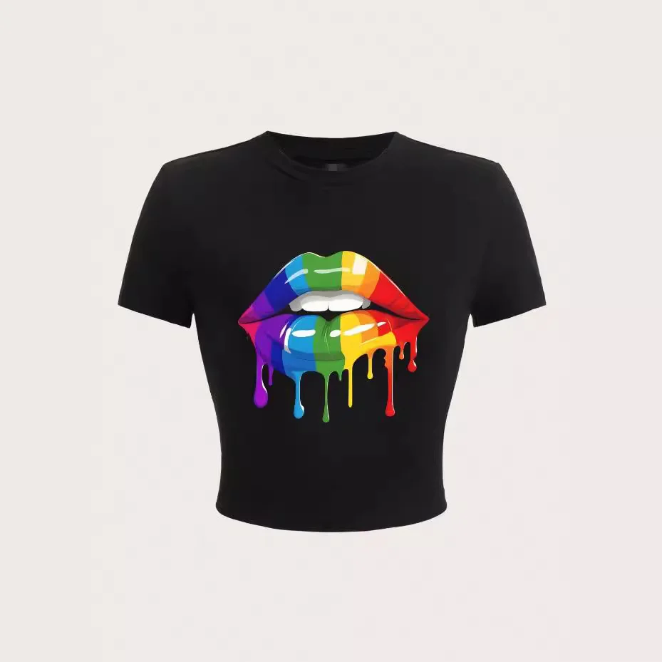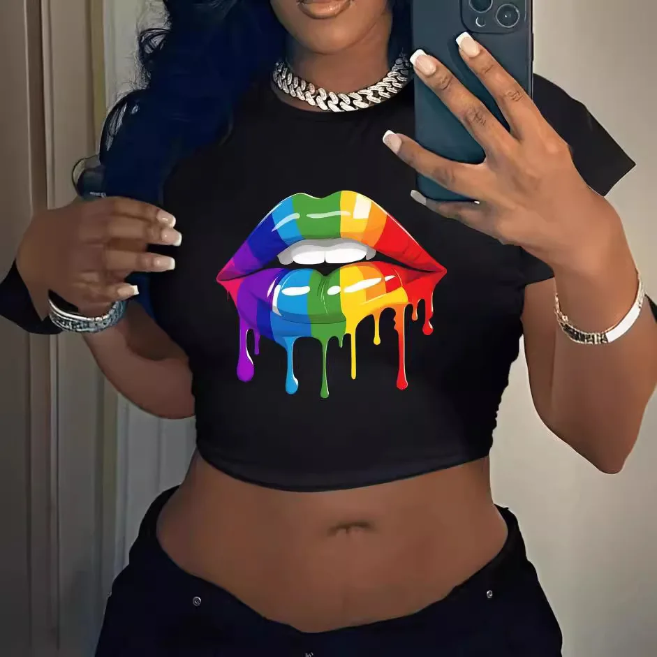 Summer Short t Shirt Short Sleeve Women's Slim Fitting Crop Top Printed Casual Knitted T-shirt