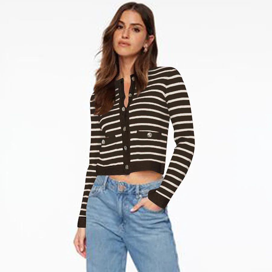 Y2K Style Ladies Short Jacket Comfortable Striped Knitted T-Shirt with Long Sleeves and Button up Top Winter Baby Tee