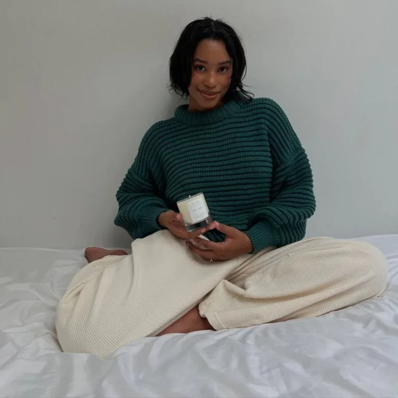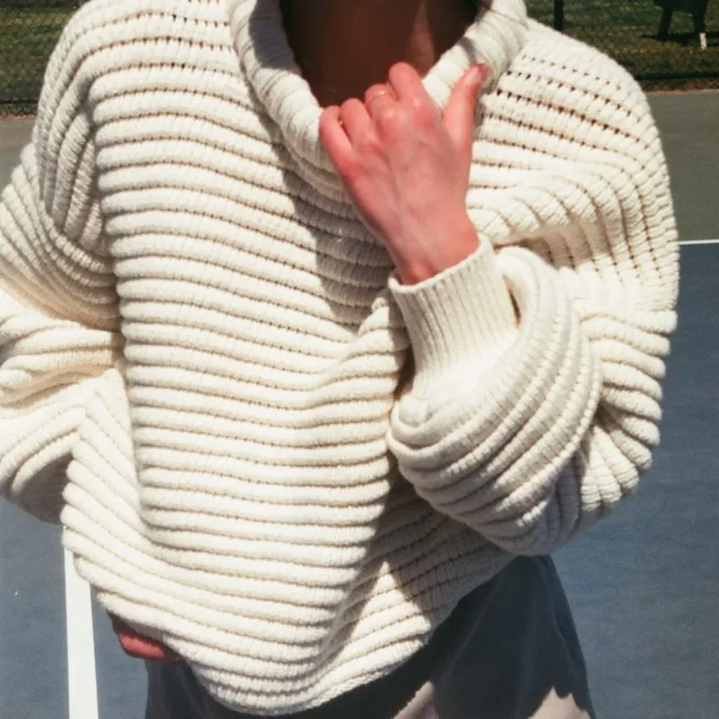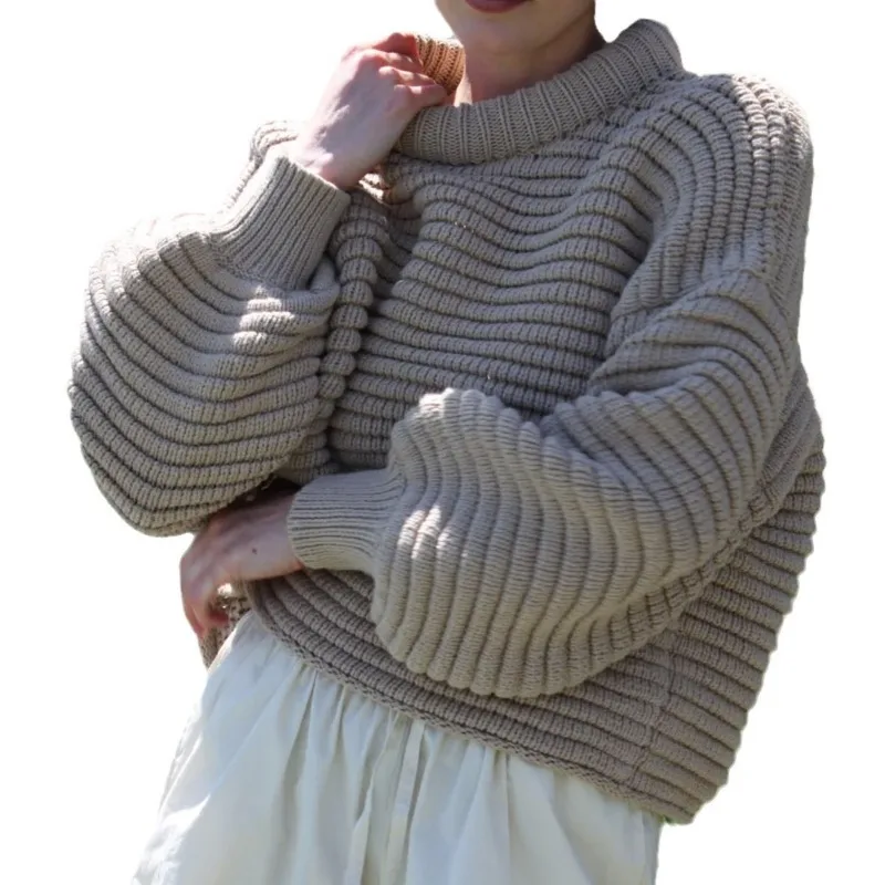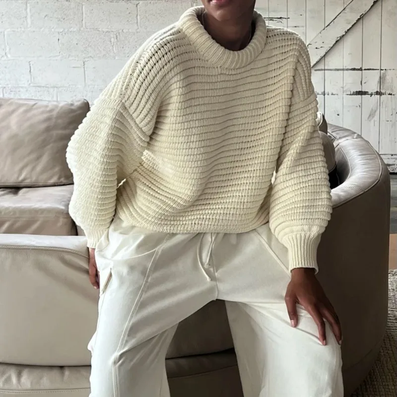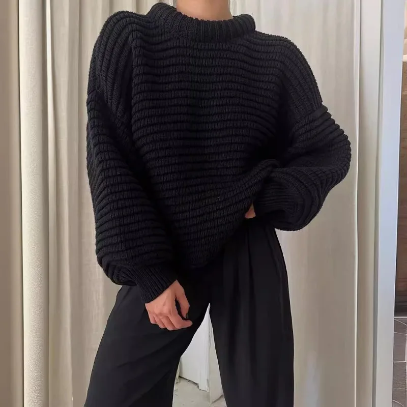 Women's Loose Pullover Striped Knitted Sweater Solid Color Casual Top for Winter with Front Logo