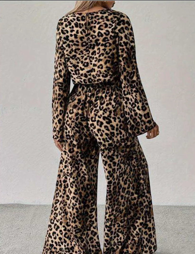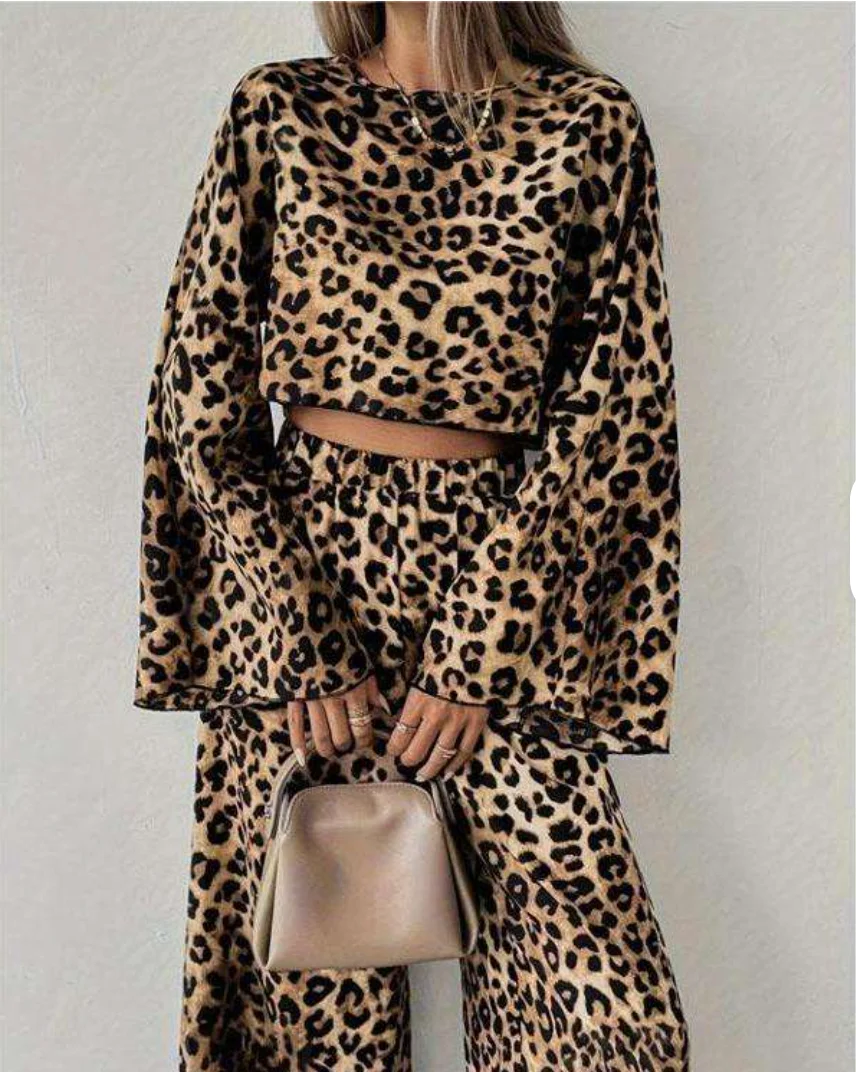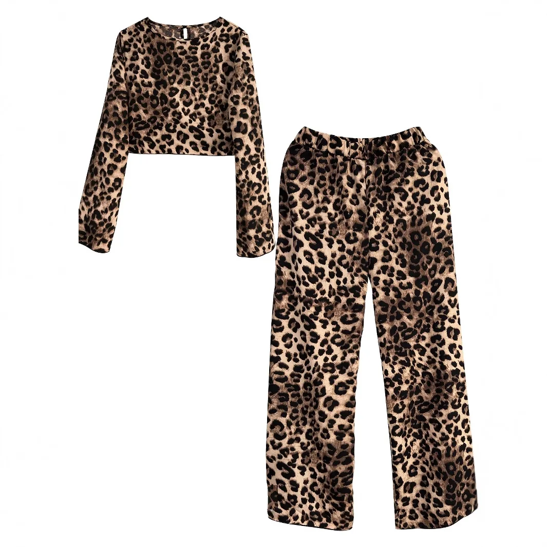 European American Cross-Border Women's Casual 2 Piece Shorts Set Leopard Print Loose Comfortable Long Sleeve Top Anti-pilling
