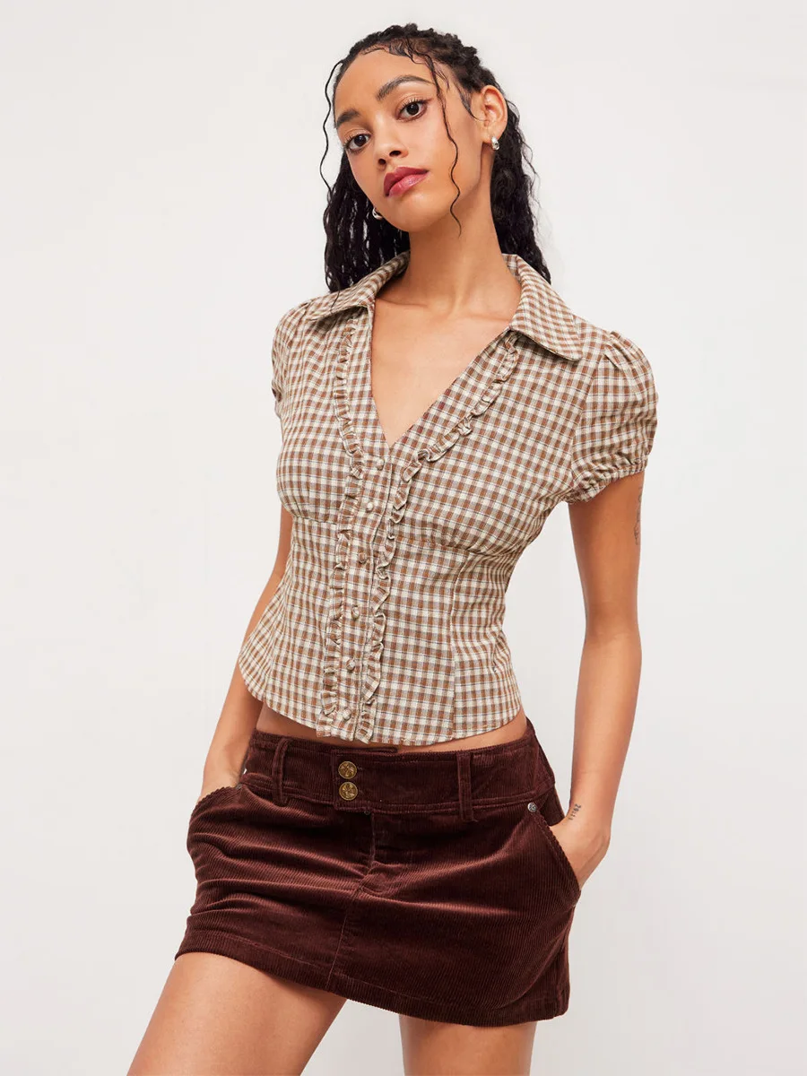 Cross-border Korean Slim Fit Bubble Sleeve Plaid Shirt 2026 Summer Cotton Broadcloth Curry Pleated Spice Girl Ear Lace-up Free