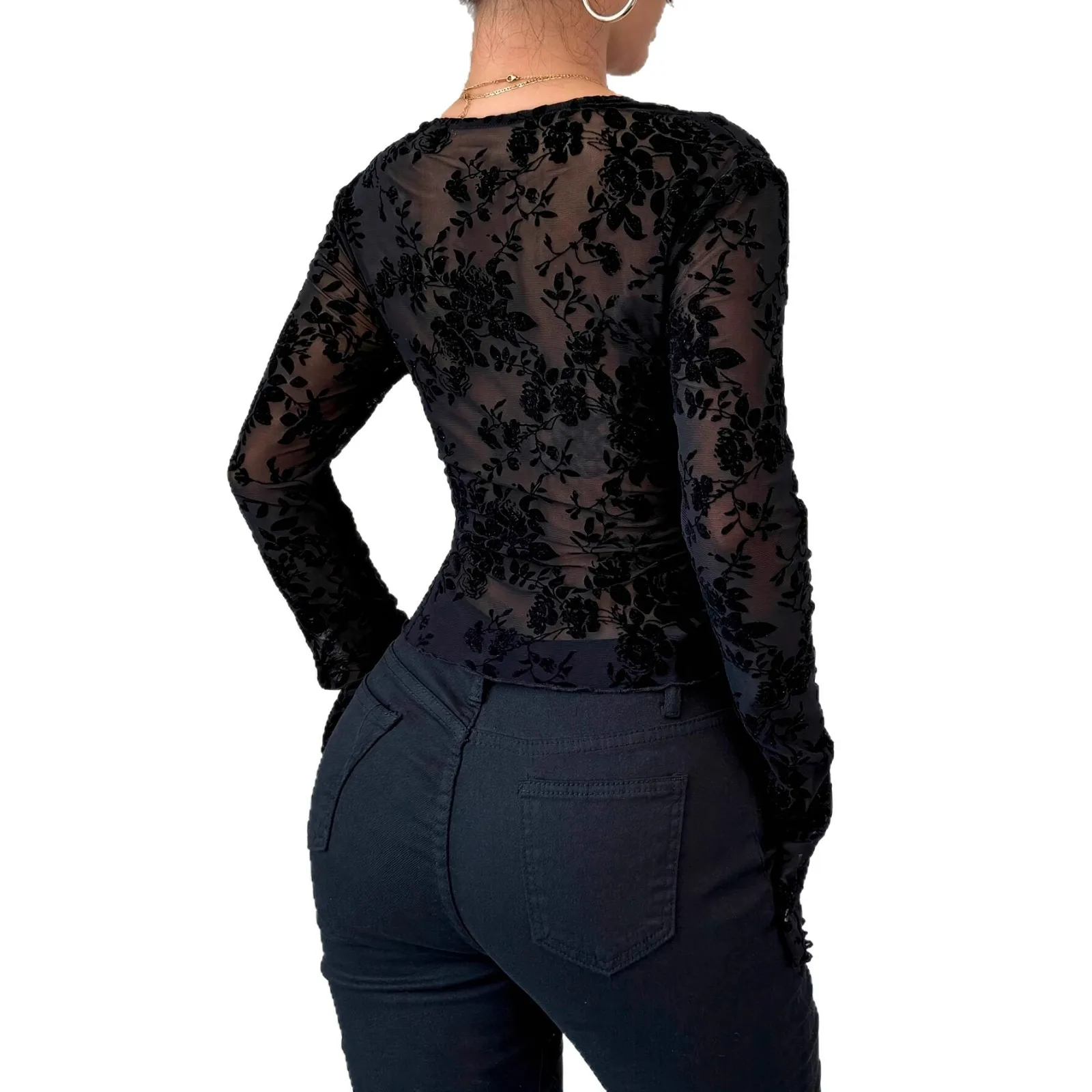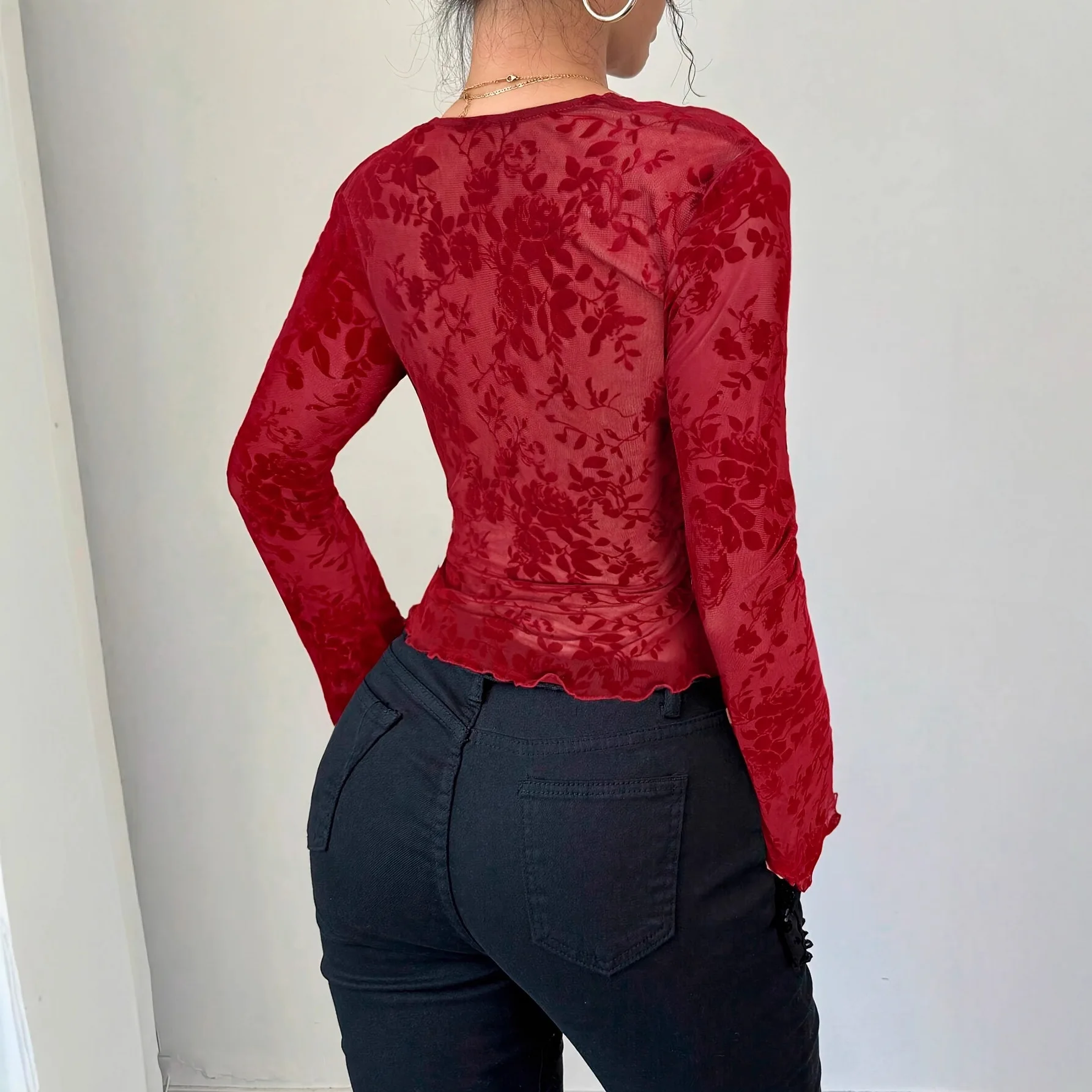 2026 Vintage Autumn Winter Women's XL Top European American Style Casual V-Neck Lace Patchwork Mesh Bell Sleeve T-Shirt