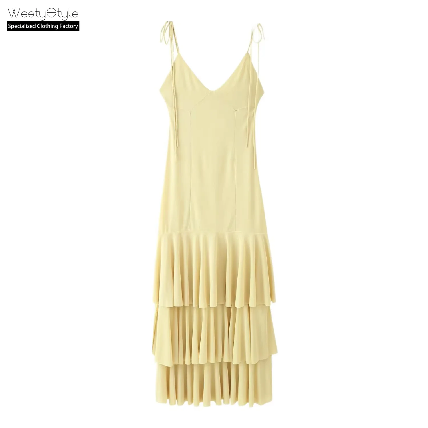 Women's Summer Chic Vintage Midi Dress Sleeveless Lace Decorative V-Neck Casual Halter Style XS New Robe Chiffon