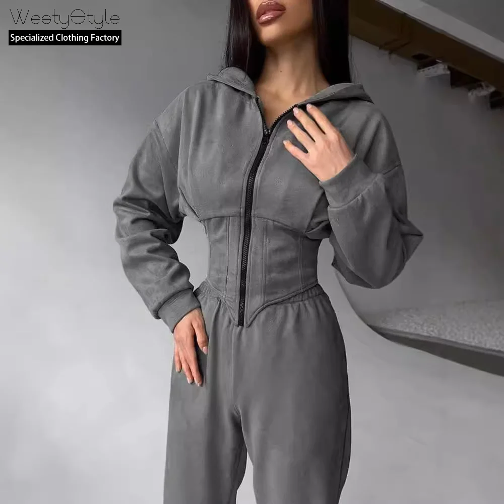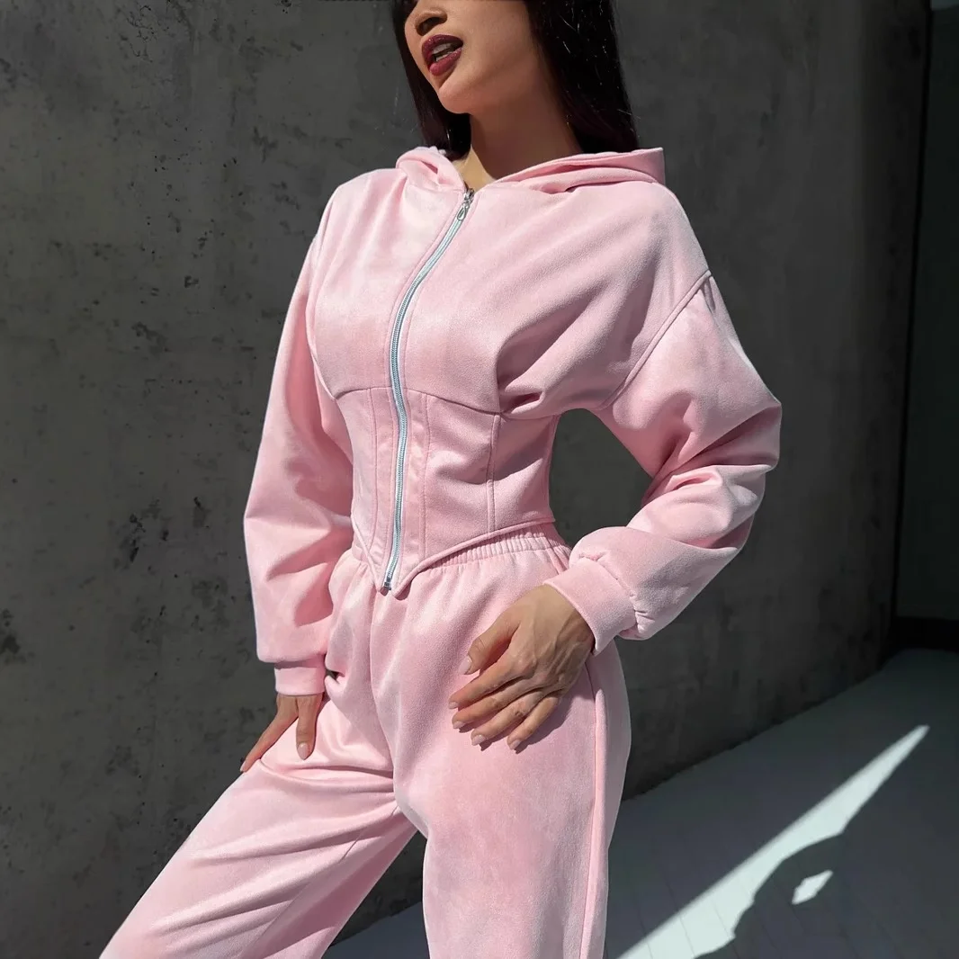 European American Style Women's Autumn Sports Casual Two-Piece Set Solid Color Waist-Cinching Hooded Sweatshirt Long 100%