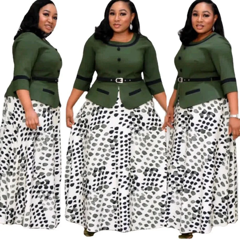 Source Factory African Large Size Women's New Printed Faux Fur Dashiki Round Neck Seven-point Sleeve Long Dress with Belt