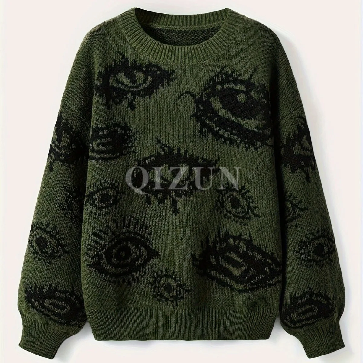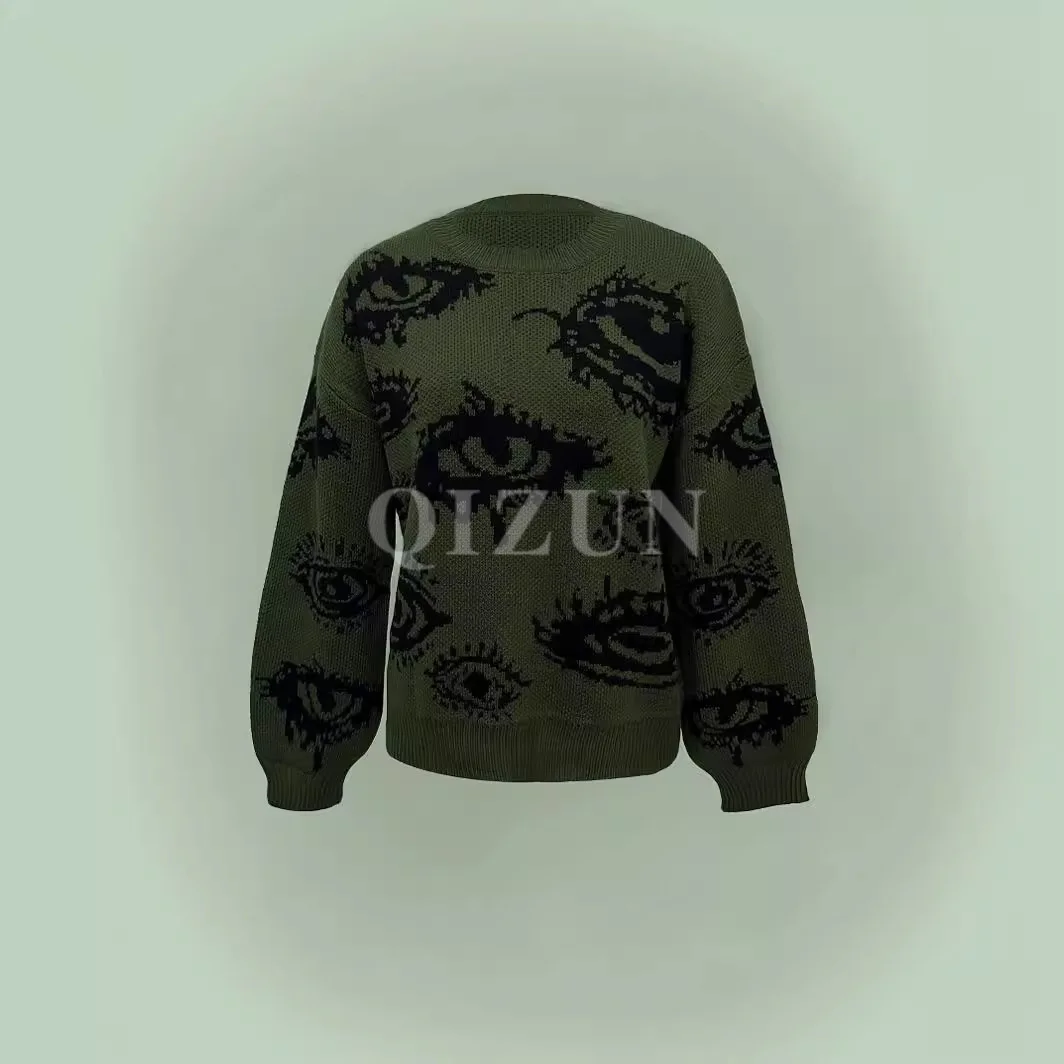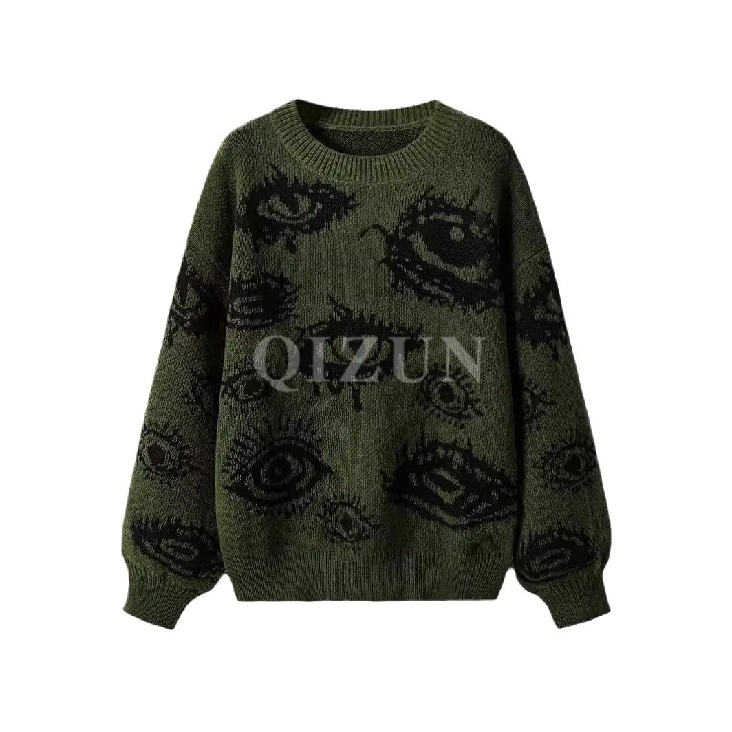 Autumn Winter Korean Crewneck Loose Medium Length Street-feeling Jacquard Acrylic Geometric Pattern Pullover Sweater Women