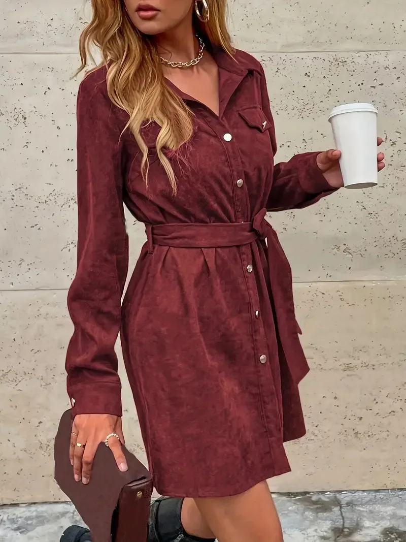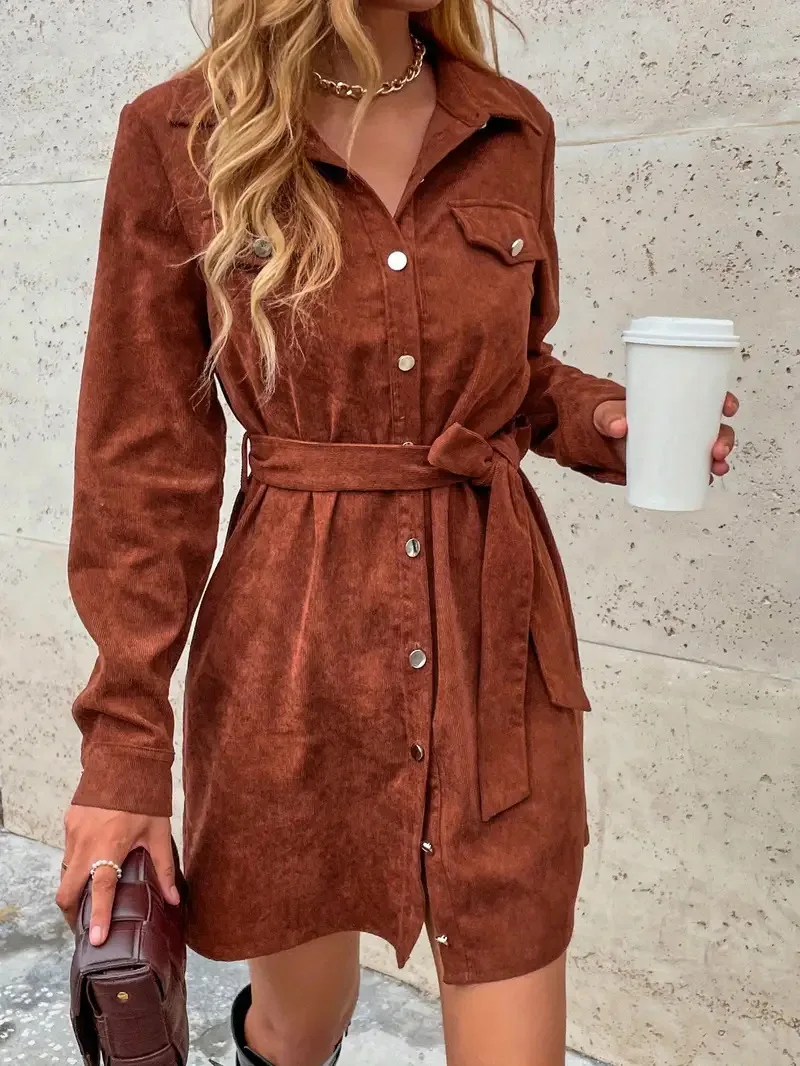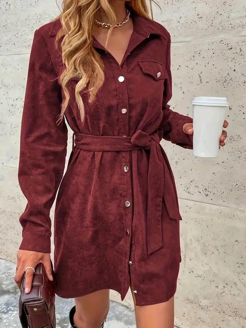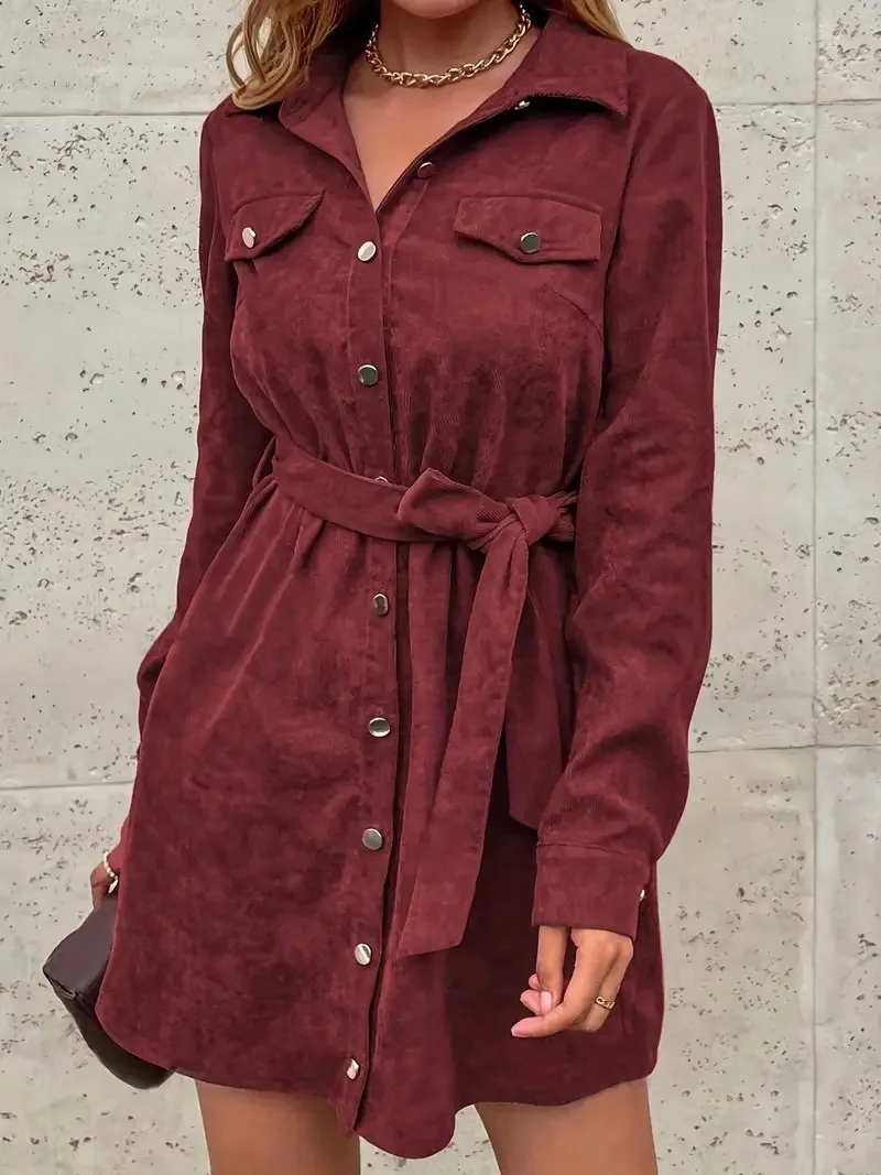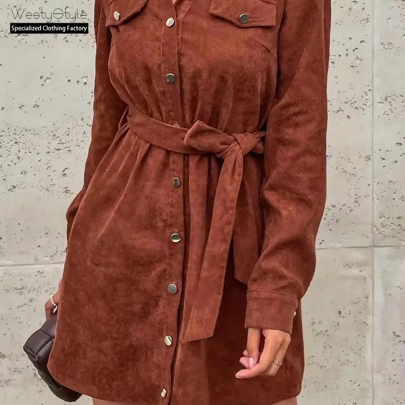 WestyStyle Women's Elegant Temperament Solid Woven Corduroy Empire Waist Full Sleeve Mini Dress Casual Breathable Washable Party