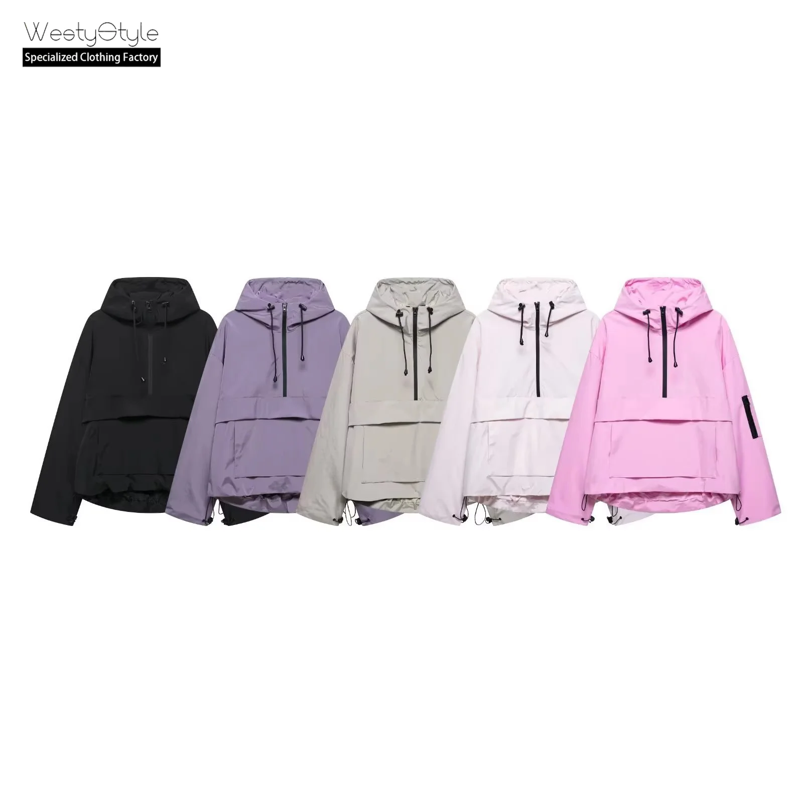 European American Style Women's Solid Front Logo Windproof Fleece Winter Hooded Stand Collar Woven Leisure Sports Jacket