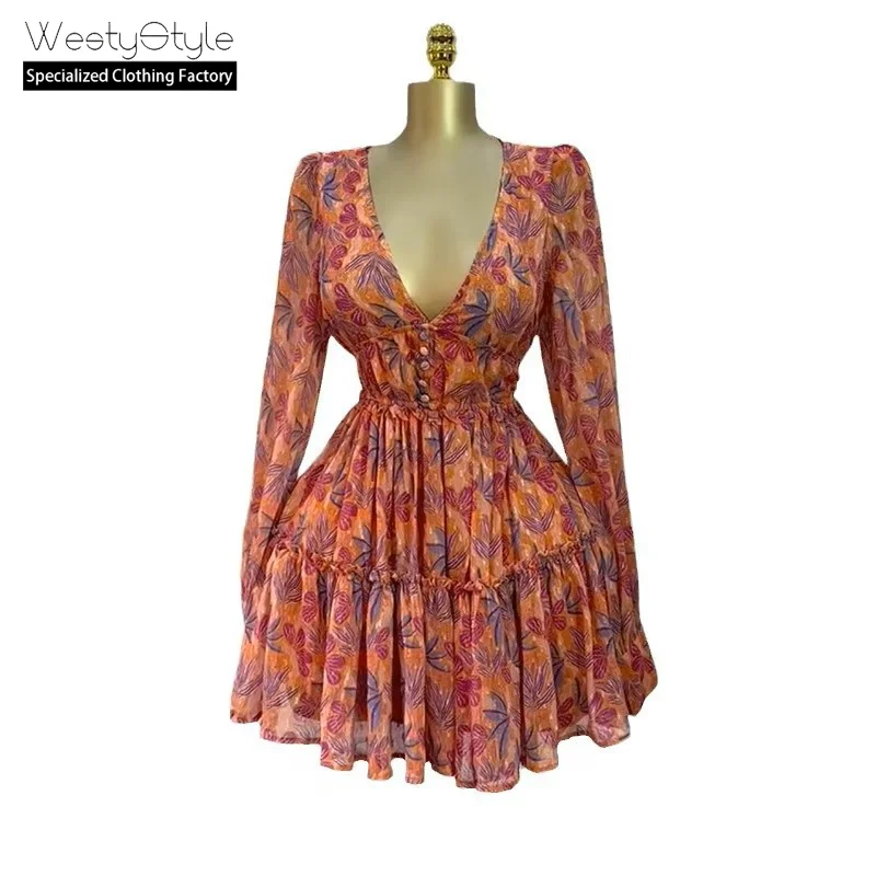Women's Casual High Waist Slimming Short Skirt Fresh Printed V-Neck Dress Spring New Collection Natural Front Chiffon Fabric Day