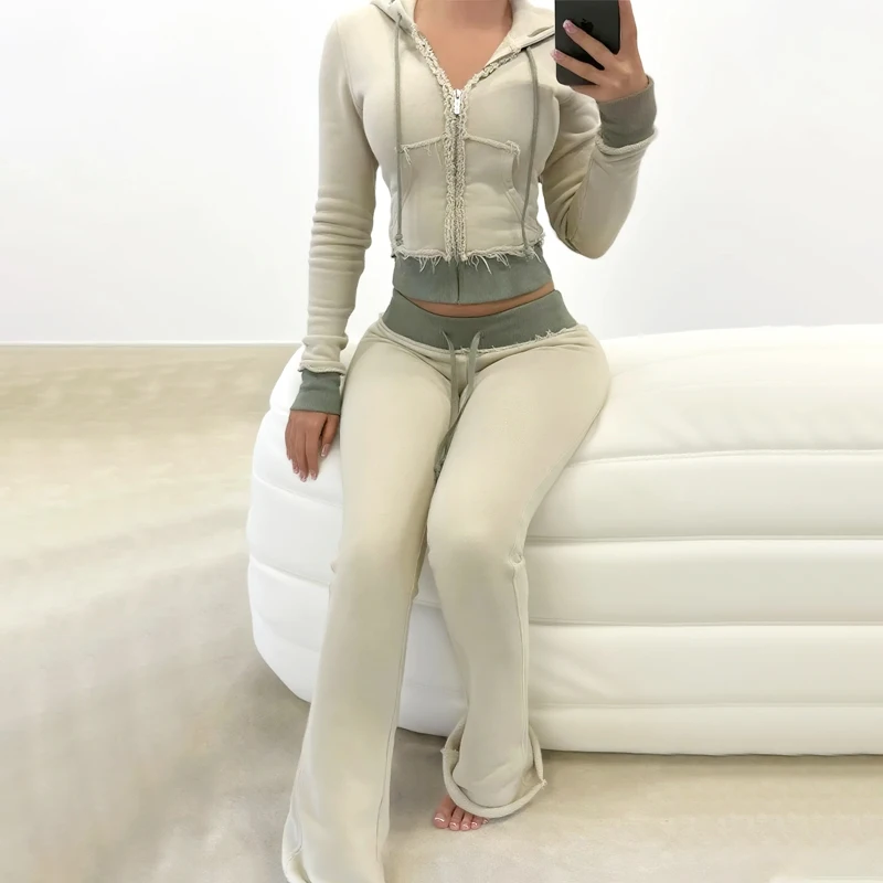 Custom French Terry Embroidery Women's Hoodies Joggers Set Full Zip up Cropped Design Sports Wear Two Piece Sets Women Outfits