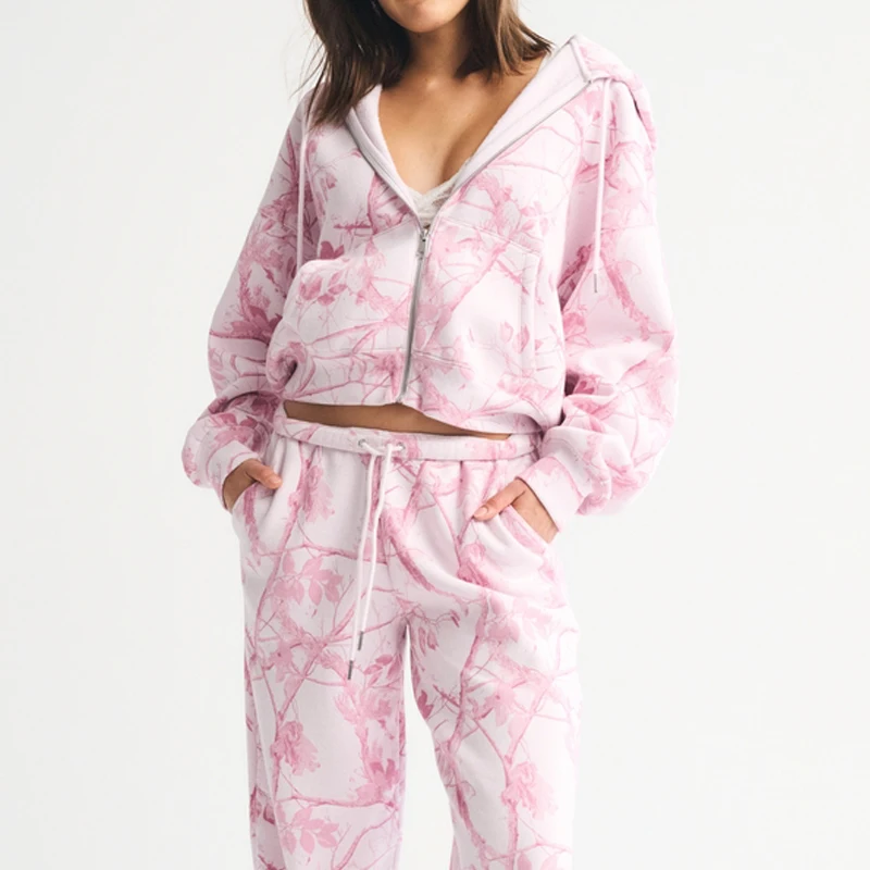 Custom High Quality Clothing Heavyweight Pink Tie Dye Cotton Fleece Full Zip Hoodie and Sweatpants Set for Women