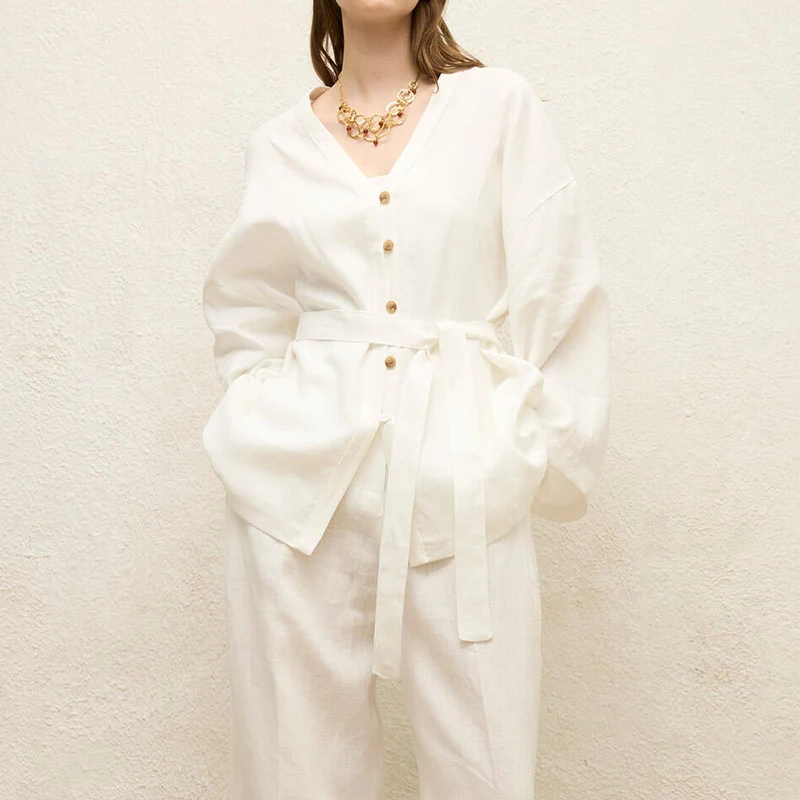 Wholesale Women Clothing Linen Shirts Casual Cotton Long Sleeve Shirt Loose Blouses with Belted for Ladies