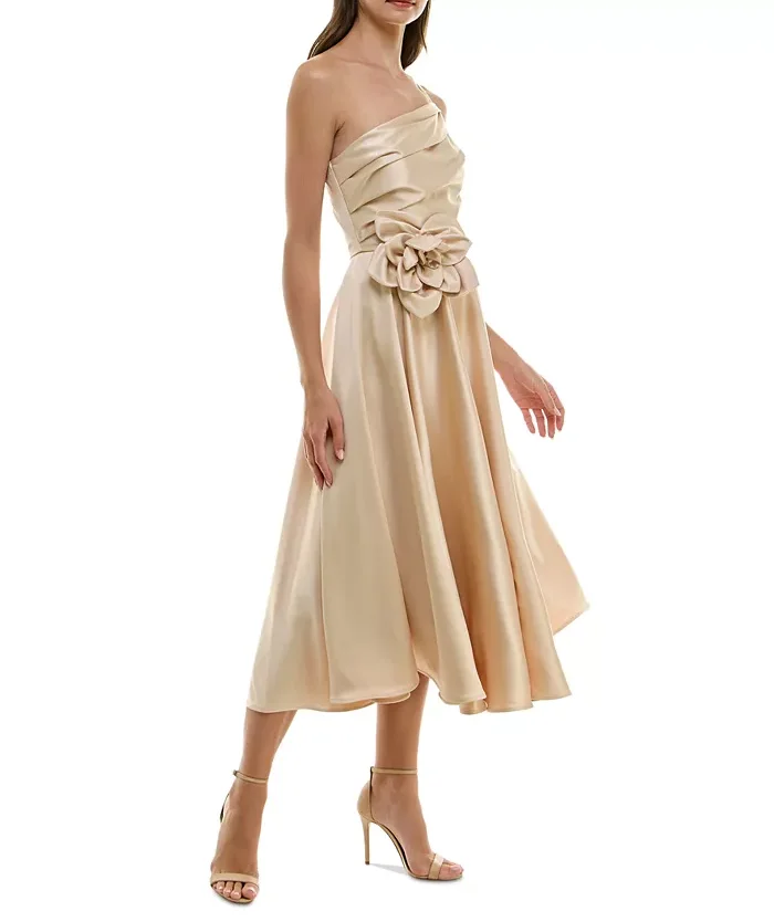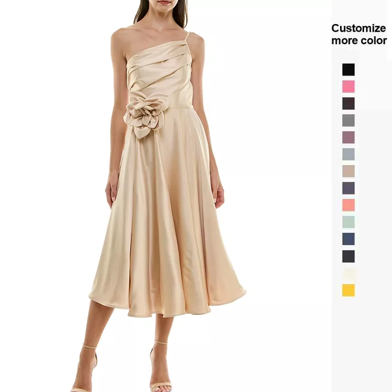Summer New Elegant Bridesmaid Satin Strappy Evenving Dresses Gown Women's Asymmetric Rosette Sleeveless Midi Dress