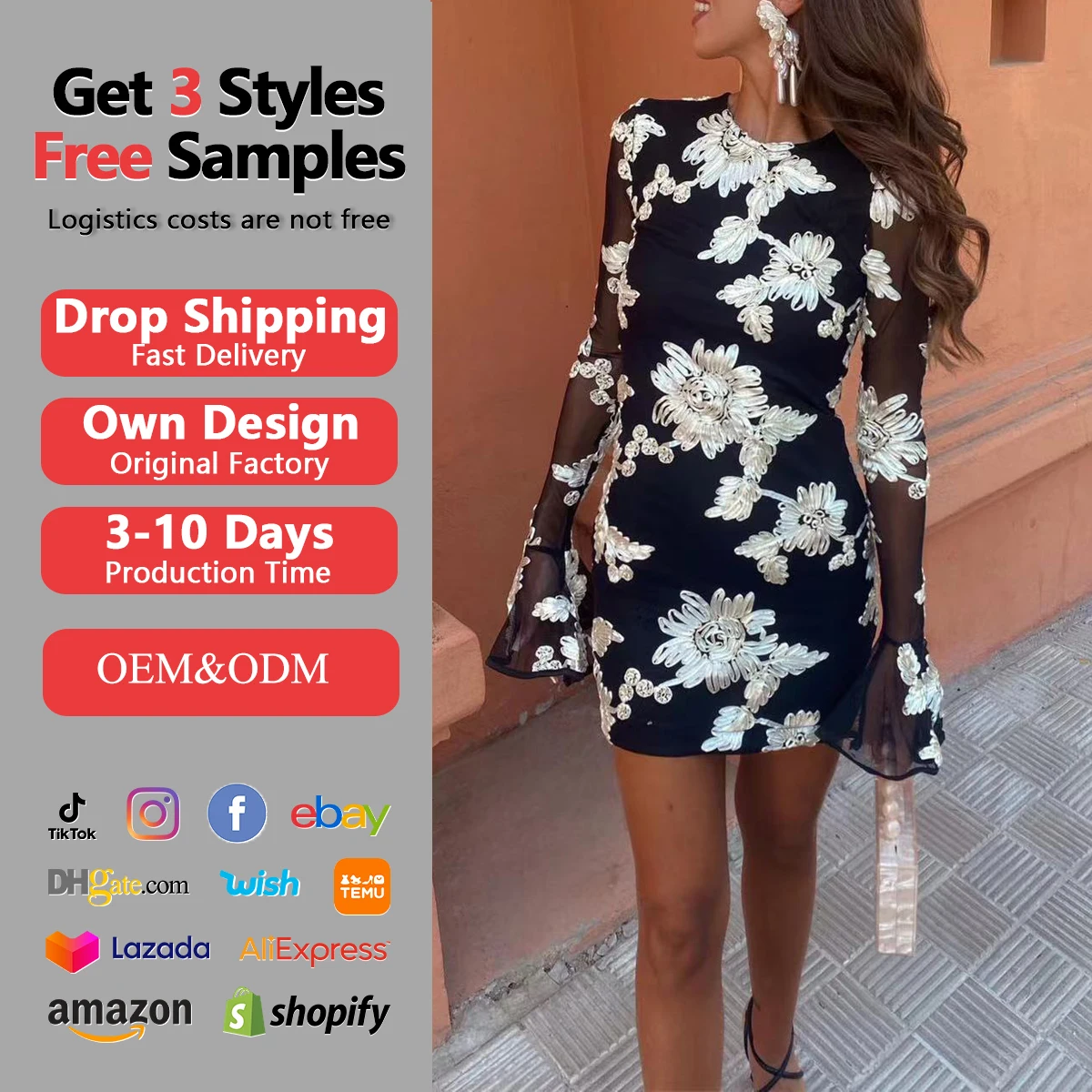 Women's Elegant Club Party Dress Sexy Short Mini Backless Flared Long Sleeves Bodycon Silhouette Lace Flower Chiffon Natural