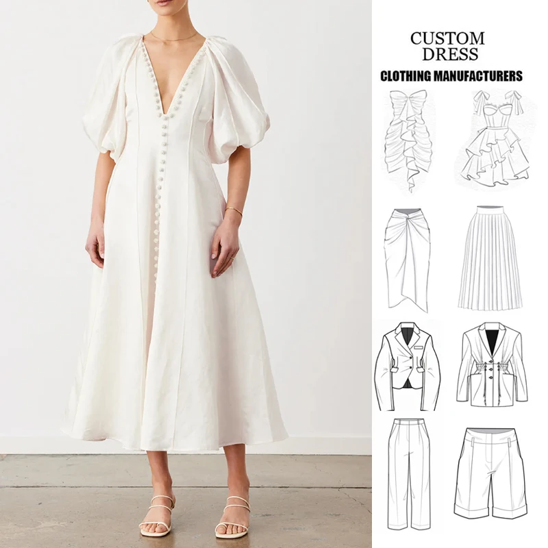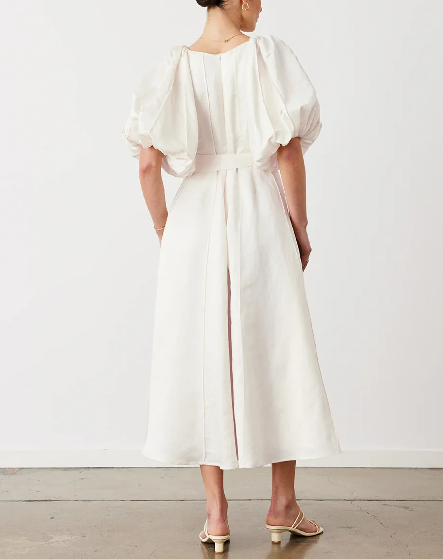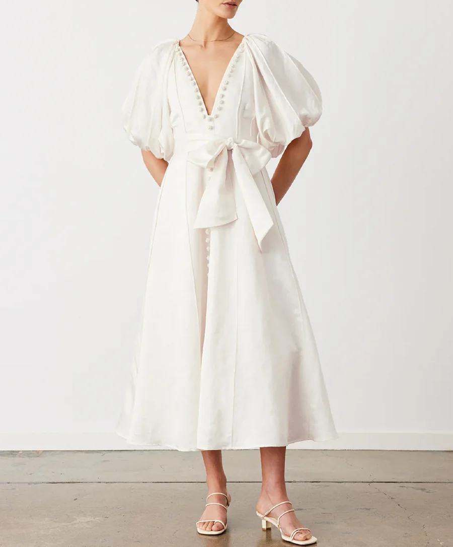 Women's Flare Midi-length Dress Silk-linen Elegance Bead Buttons Balloon Style Sleeves Deep v Neck Casual Dress