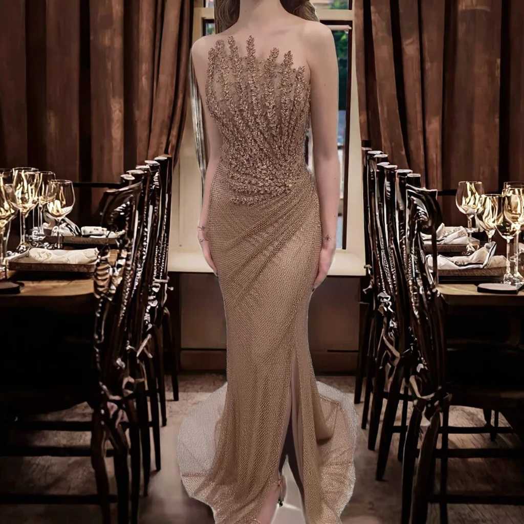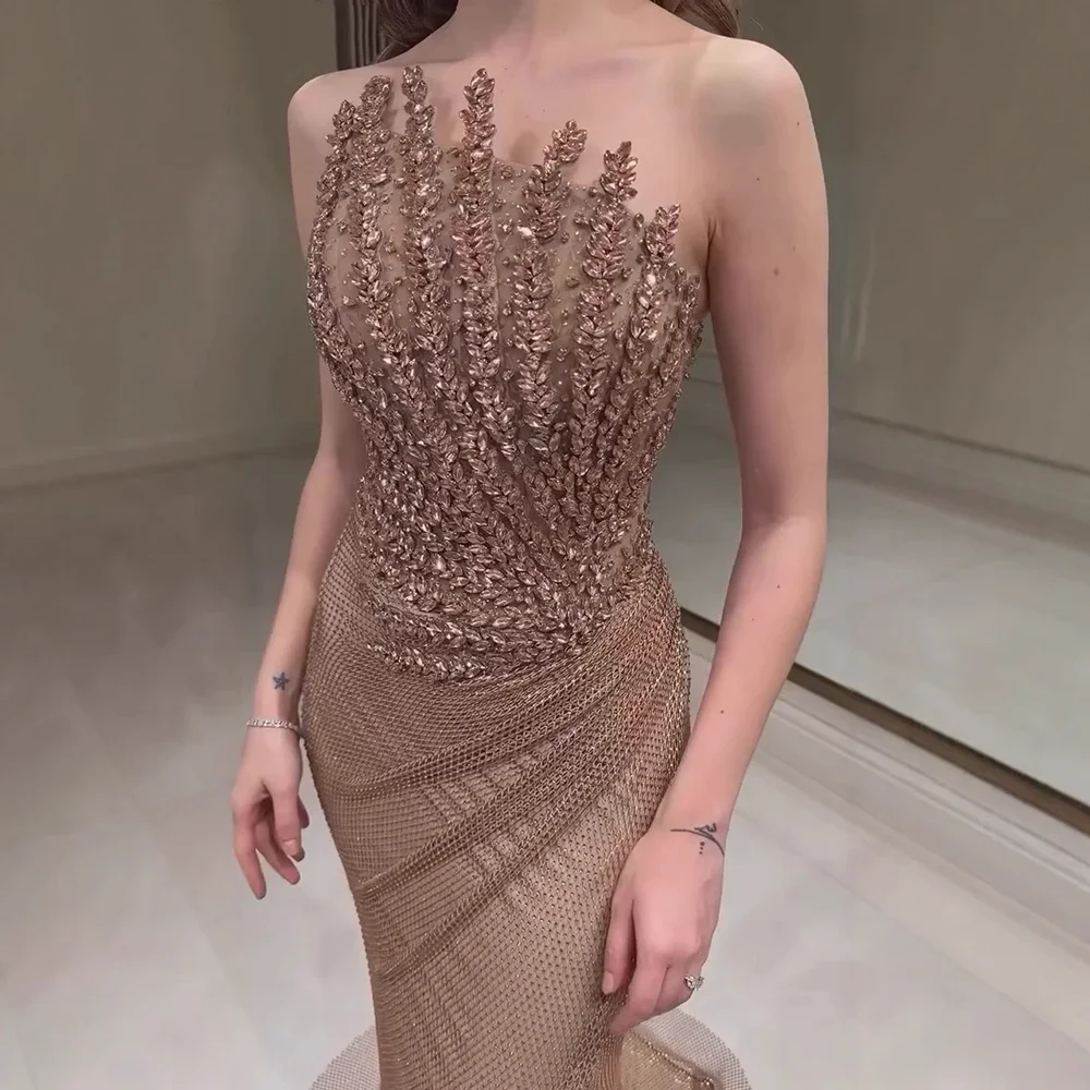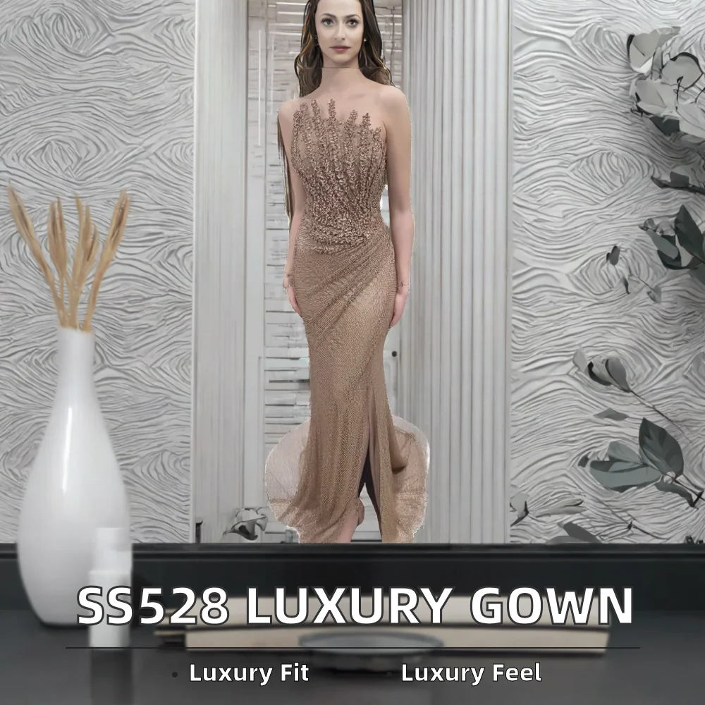 Sharon Said SS528 Luxury Dubai Caramel Mermaid Evening for Women 2026 Sparkly Crystal Floor-Length Sweep for Weddings Proms