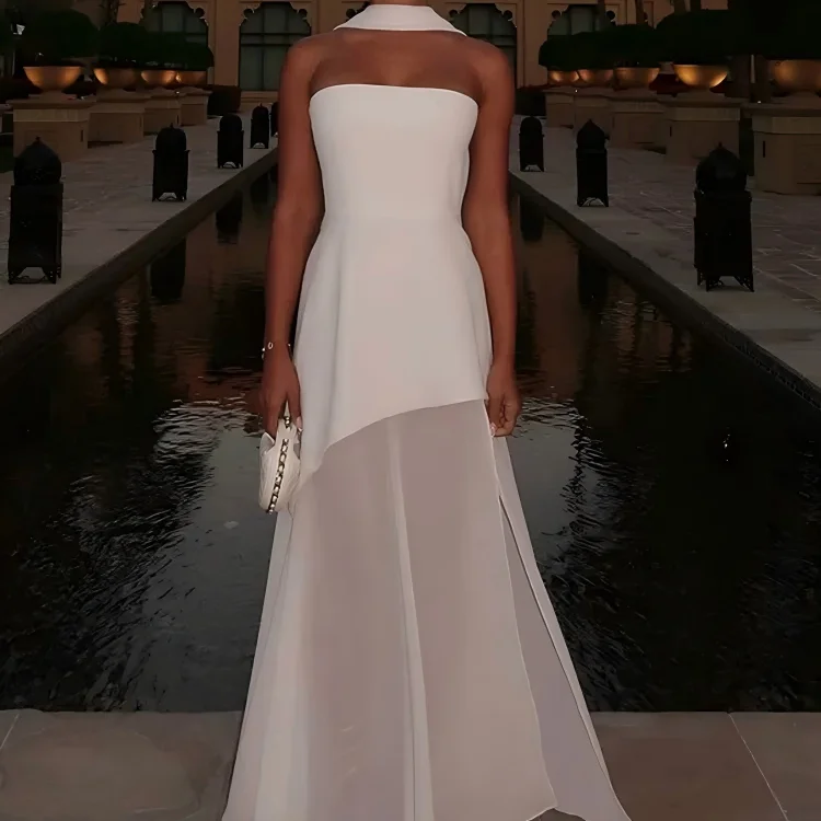 Custom Women's Summer Maxi Dress Breathable Cotton Strapless with Ribbon Front Logo Daily Style Solid Pattern Dress
