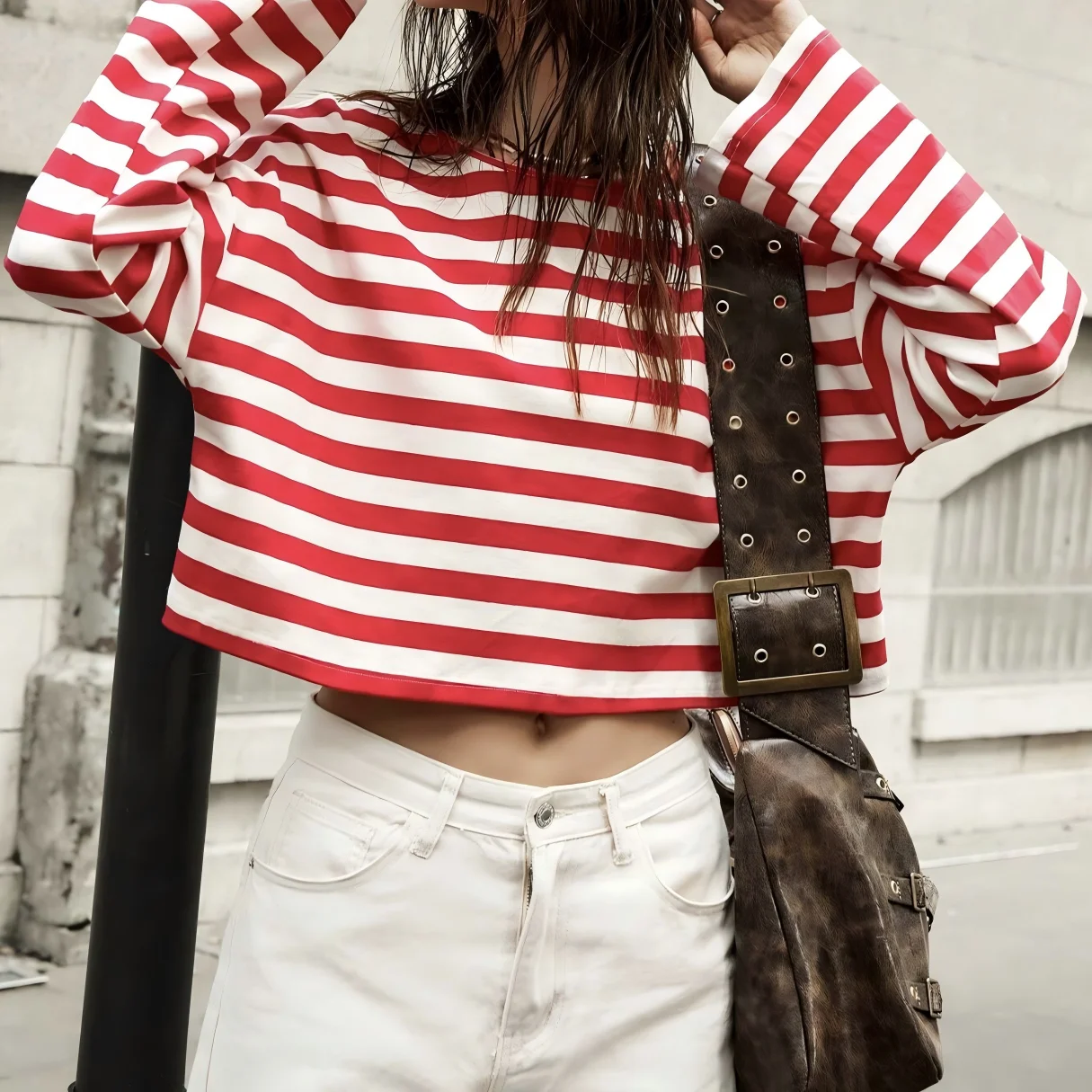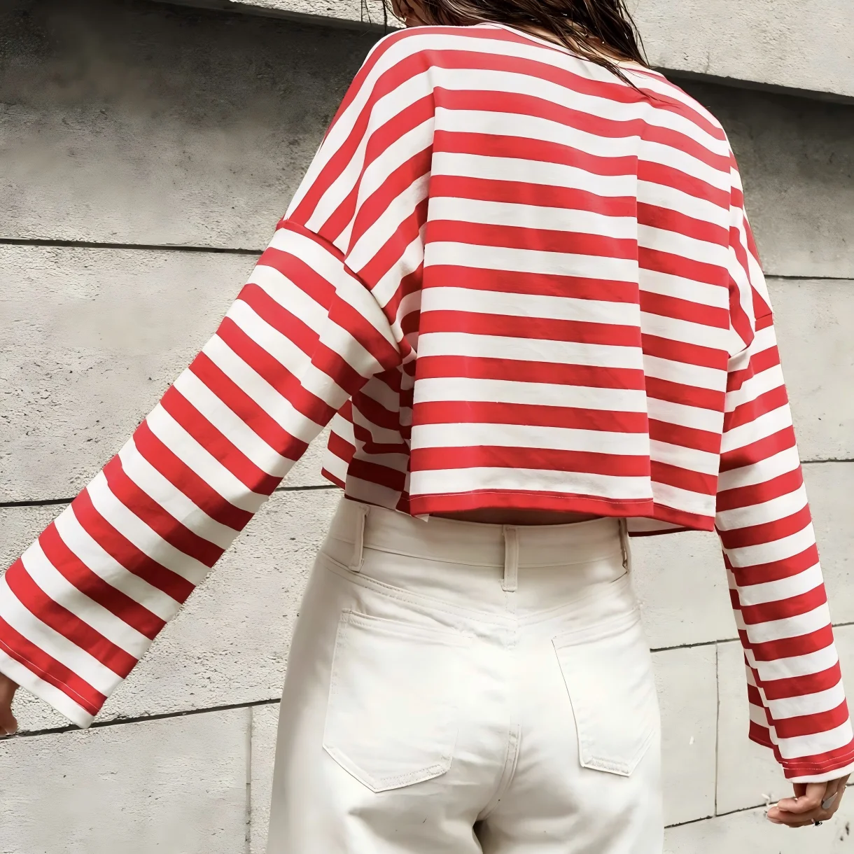 Classic Red White Stripes Women's Full-Length Fit Crop Top Oversized Embroidered Pullover Sweatshirt for Autumn Winter ODM