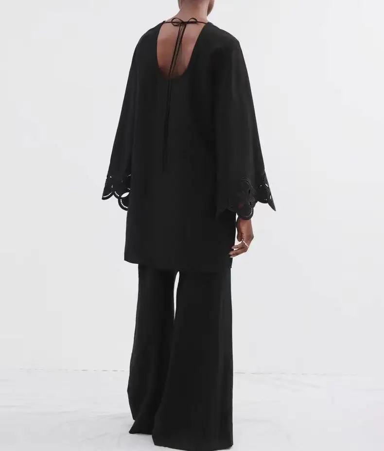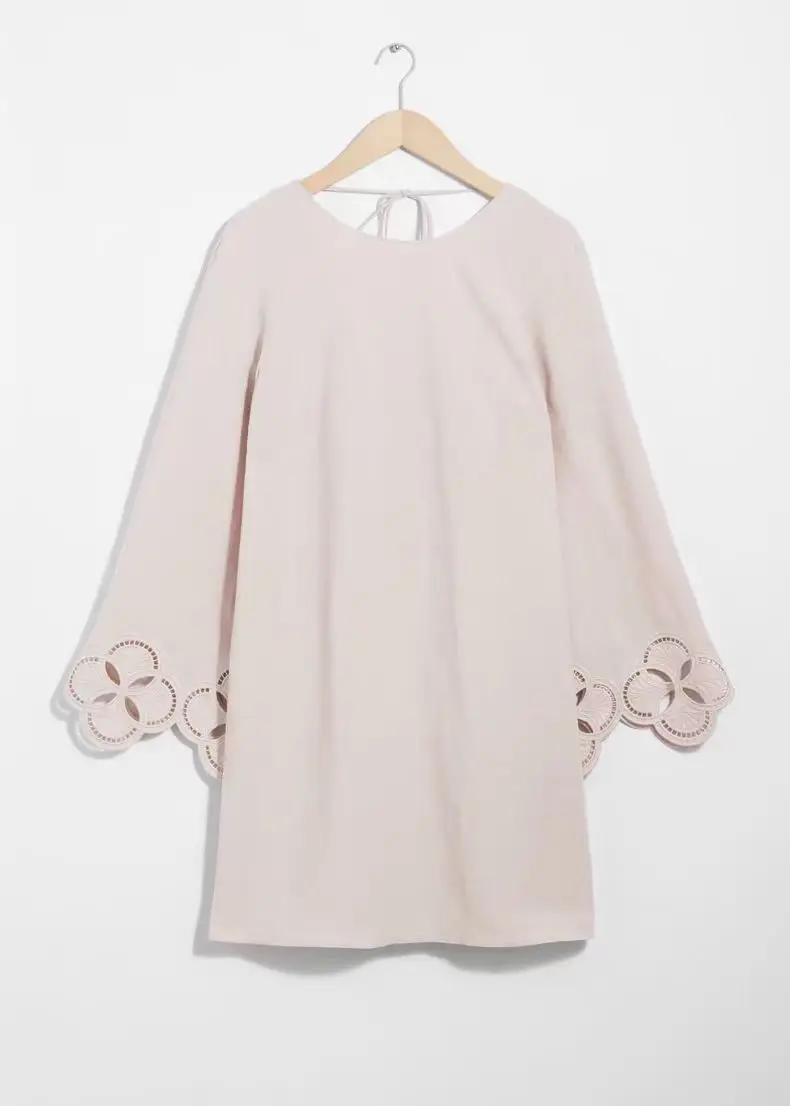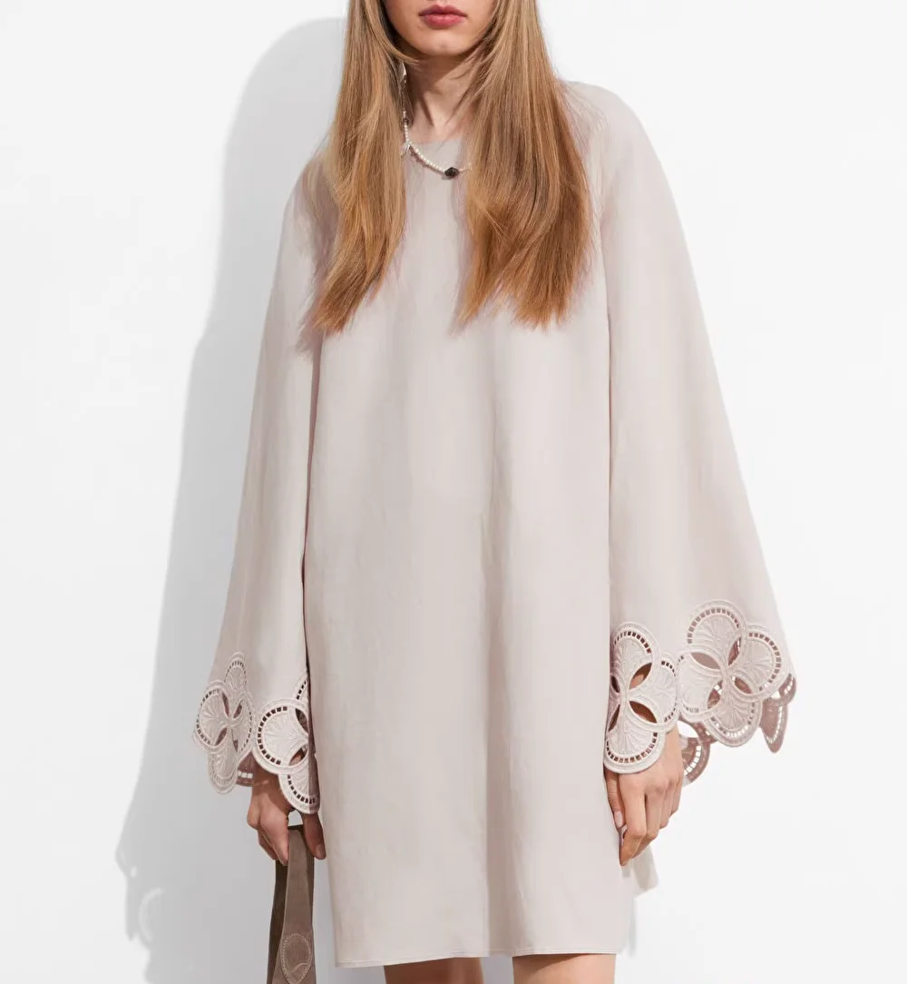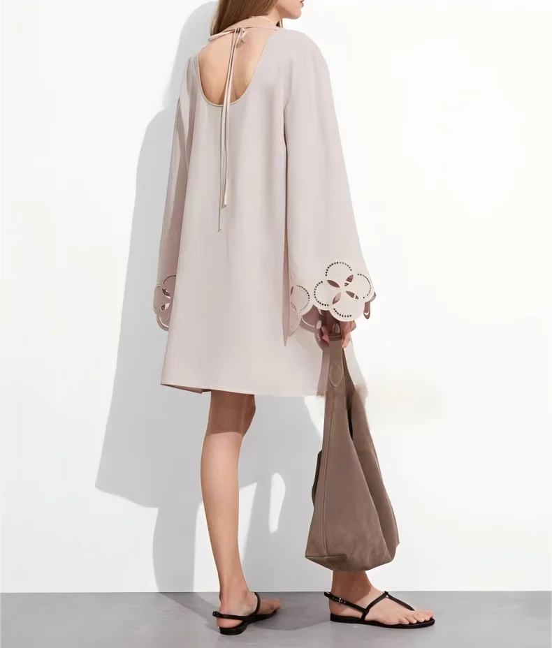 2026 Women's Luxury Fashion Hollow Linen Blend Round Neck Tie Backless Embroidery Wide Sleeves Mini Dress