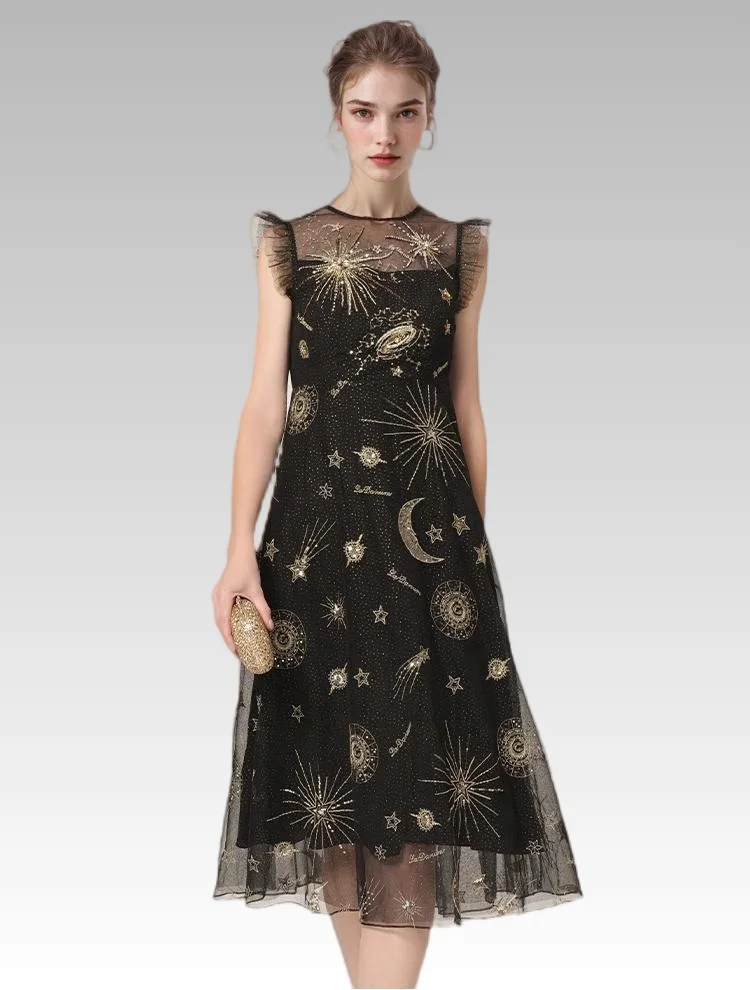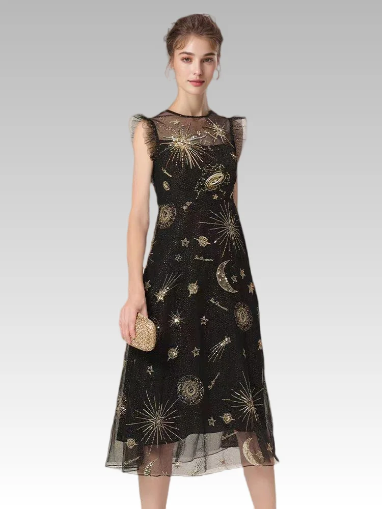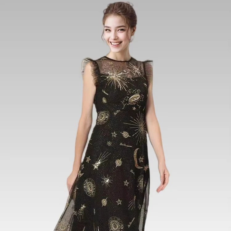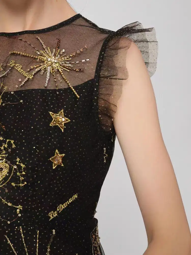 2026 Summer and Autumn Luxury Casual Women's Slim Fit Temperament Fashion New Black Mesh Embroidery Beaded Round Neck Dress